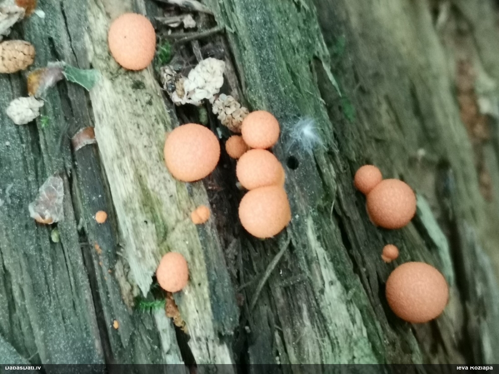 Hmm, nepievērsu tam uzmanību, bet tas interesanti, paldies! Vispār izskatās pēc vālenītes, ne kūlītes, speciāli salīdzināju aprakstus ar Stemonitis splendens, bet mikroskopiski tomēr atbilst visām kūlītes pazīmēm, un abas mikroskopētās kūlītes - vienādas. Tur kāds skujkoks blakus neaug?