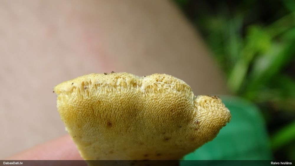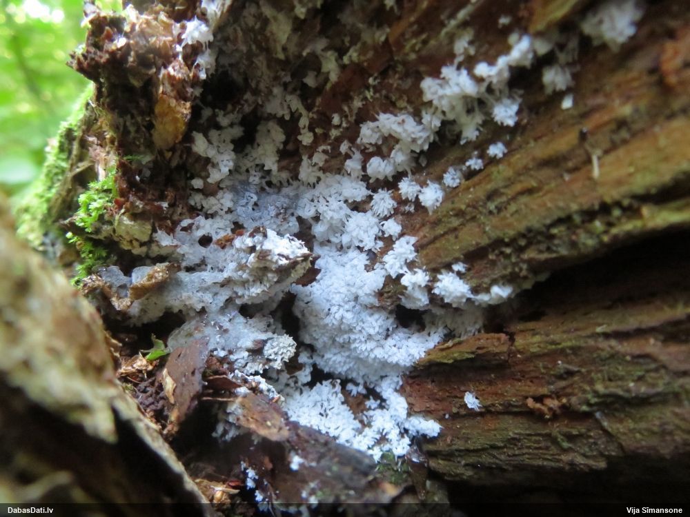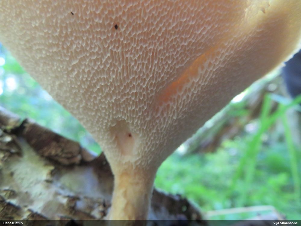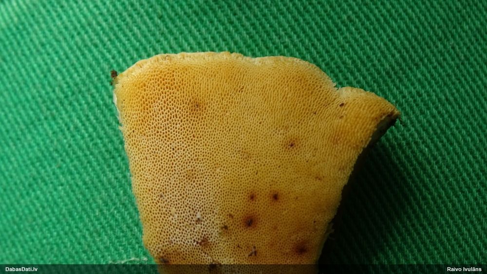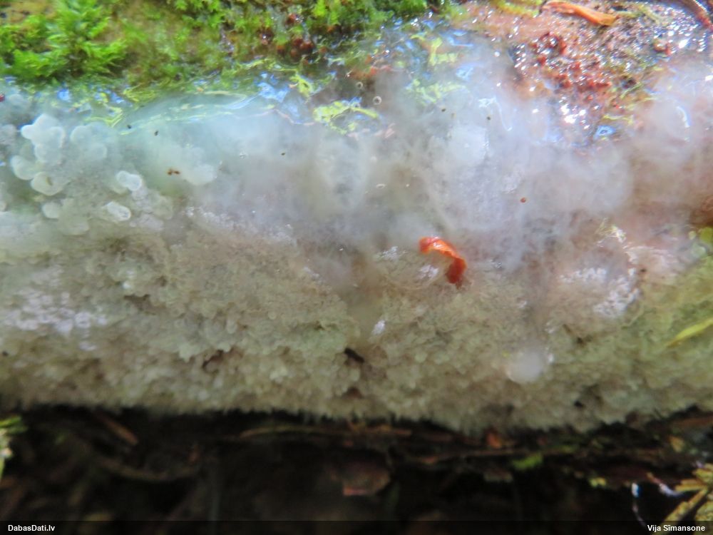 Šim Vijas paraugam iekšas precīzi tādas pašas - baltdzeltenas, ar kapilīciju ar maziem mezgliem, un virsma balta. Sporas gan lielākas: https://dabasdati.lv/lv/observation/b146f03a39b8789e2897007d9e464255/