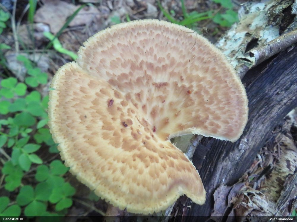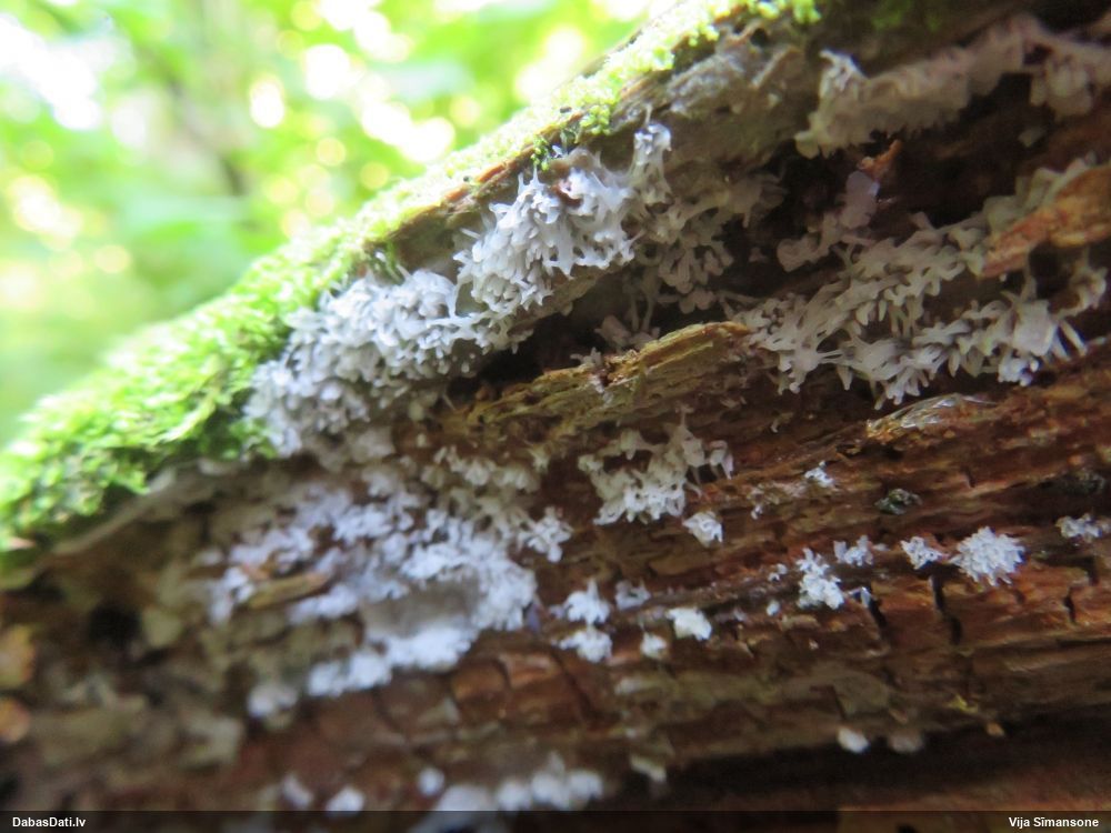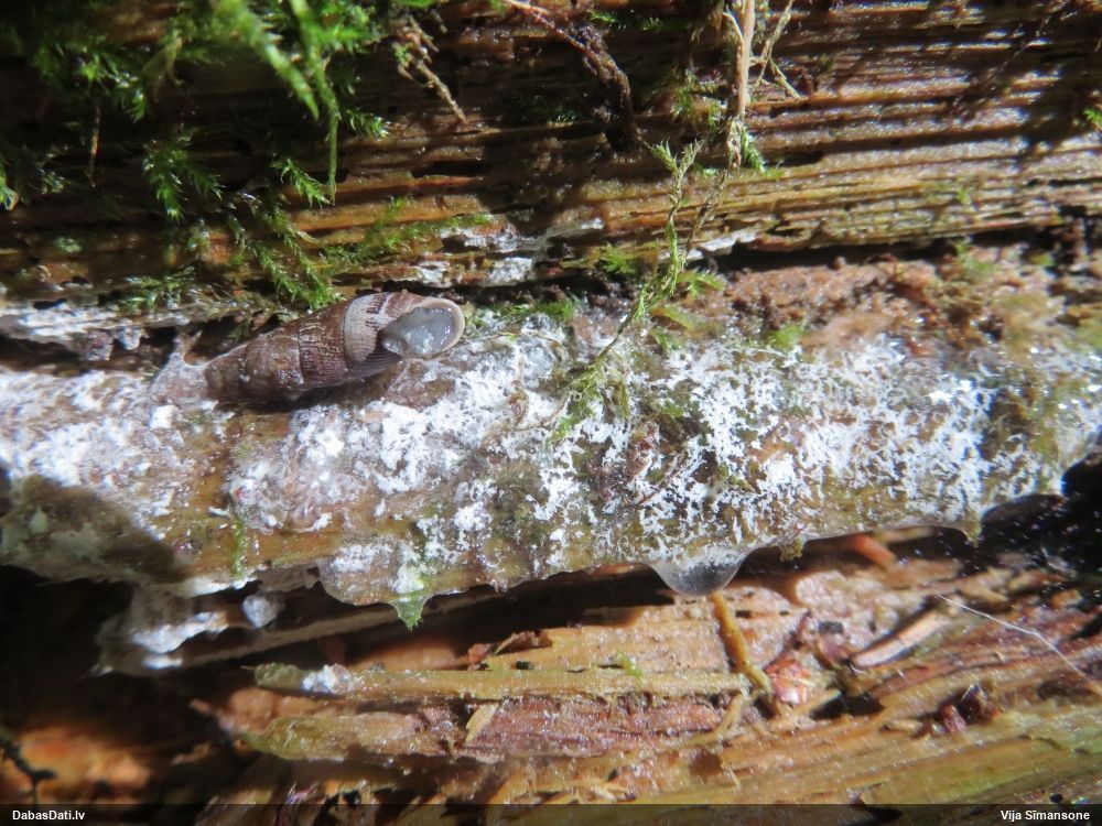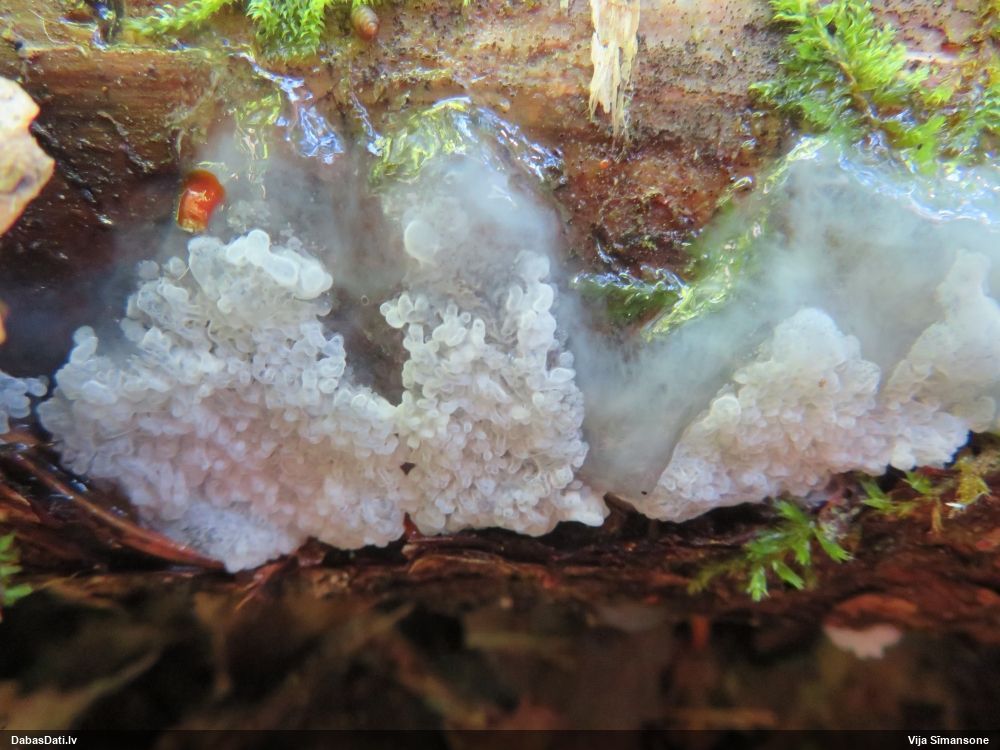 Šim Vijas paraugam iekšas precīzi tādas pašas - baltdzeltenas, ar kapilīciju ar maziem mezgliem, un virsma balta. Sporas gan lielākas: https://dabasdati.lv/lv/observation/b146f03a39b8789e2897007d9e464255/