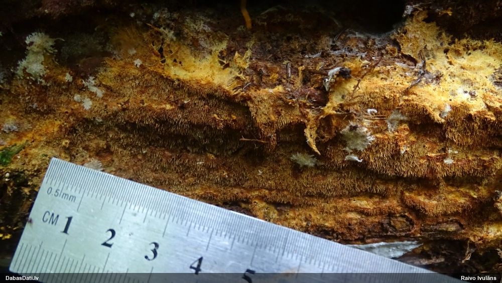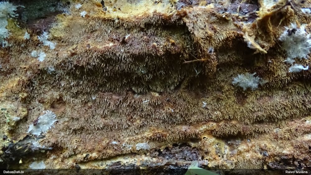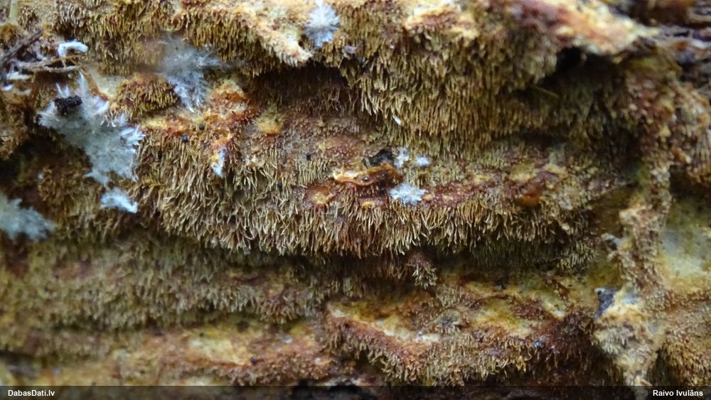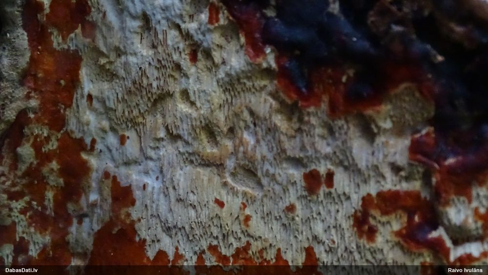 Šim Vijas paraugam iekšas precīzi tādas pašas - baltdzeltenas, ar kapilīciju ar maziem mezgliem, un virsma balta. Sporas gan lielākas: https://dabasdati.lv/lv/observation/b146f03a39b8789e2897007d9e464255/
