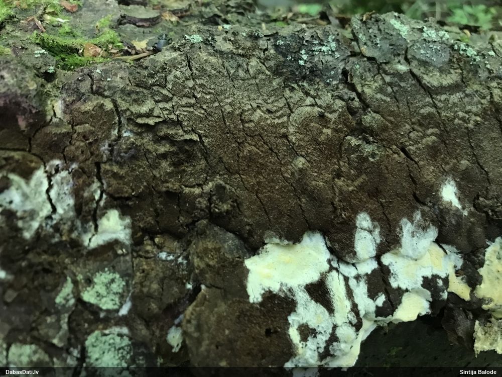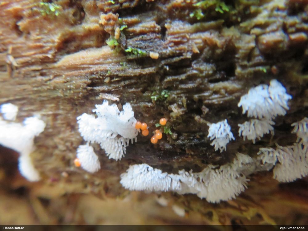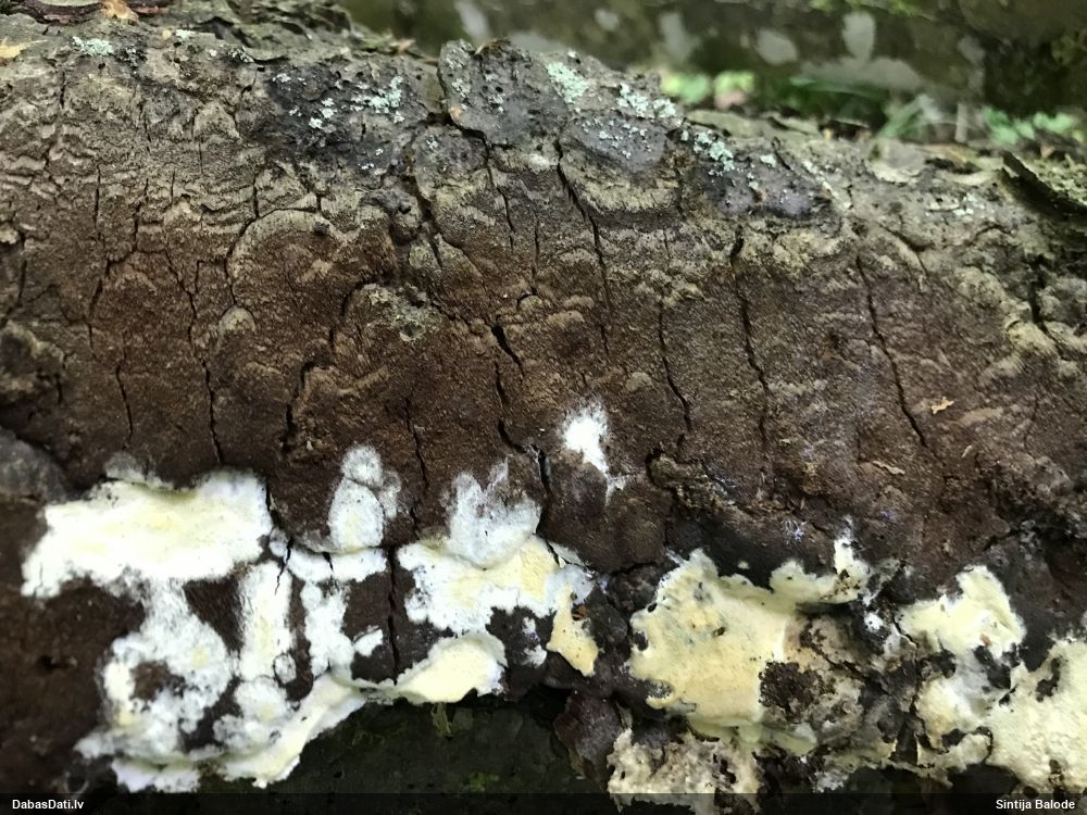 Šim Vijas paraugam iekšas precīzi tādas pašas - baltdzeltenas, ar kapilīciju ar maziem mezgliem, un virsma balta. Sporas gan lielākas: https://dabasdati.lv/lv/observation/b146f03a39b8789e2897007d9e464255/