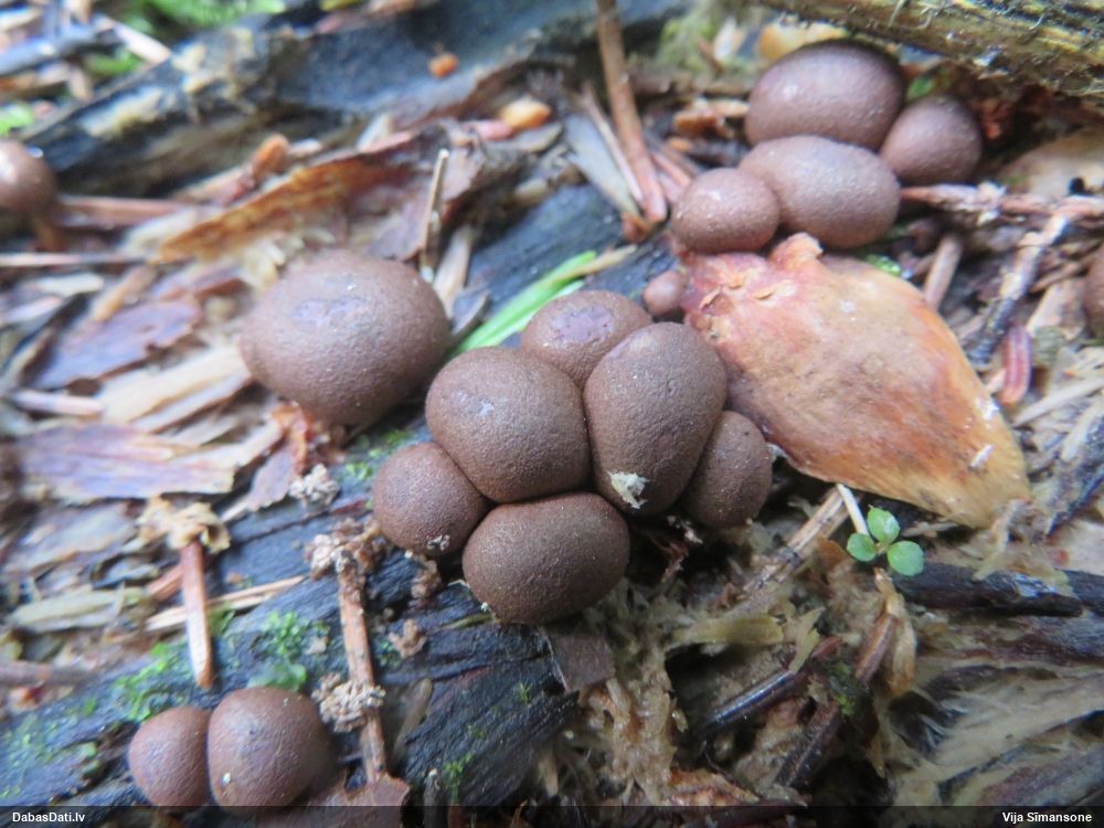 Hmm, nepievērsu tam uzmanību, bet tas interesanti, paldies! Vispār izskatās pēc vālenītes, ne kūlītes, speciāli salīdzināju aprakstus ar Stemonitis splendens, bet mikroskopiski tomēr atbilst visām kūlītes pazīmēm, un abas mikroskopētās kūlītes - vienādas. Tur kāds skujkoks blakus neaug?