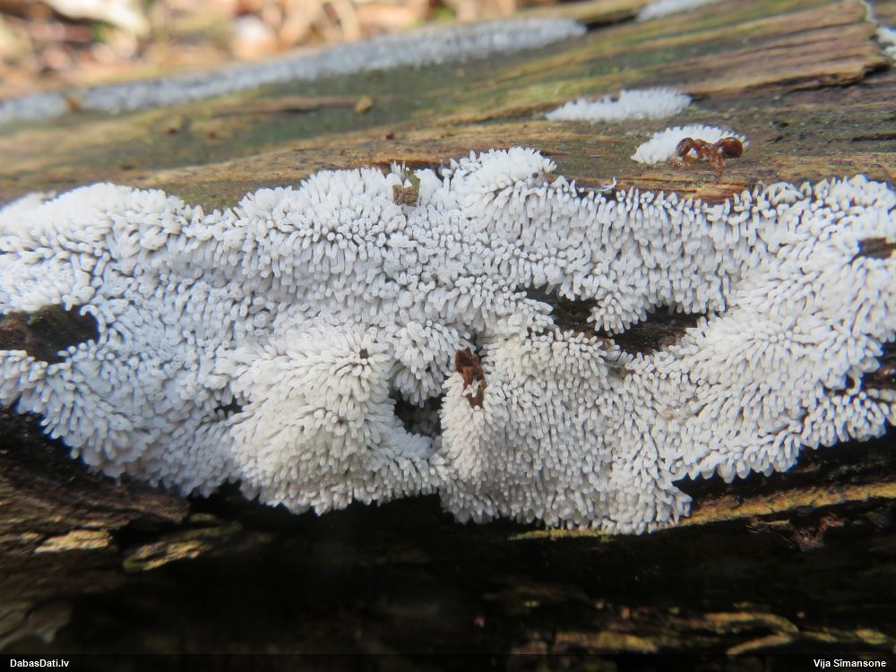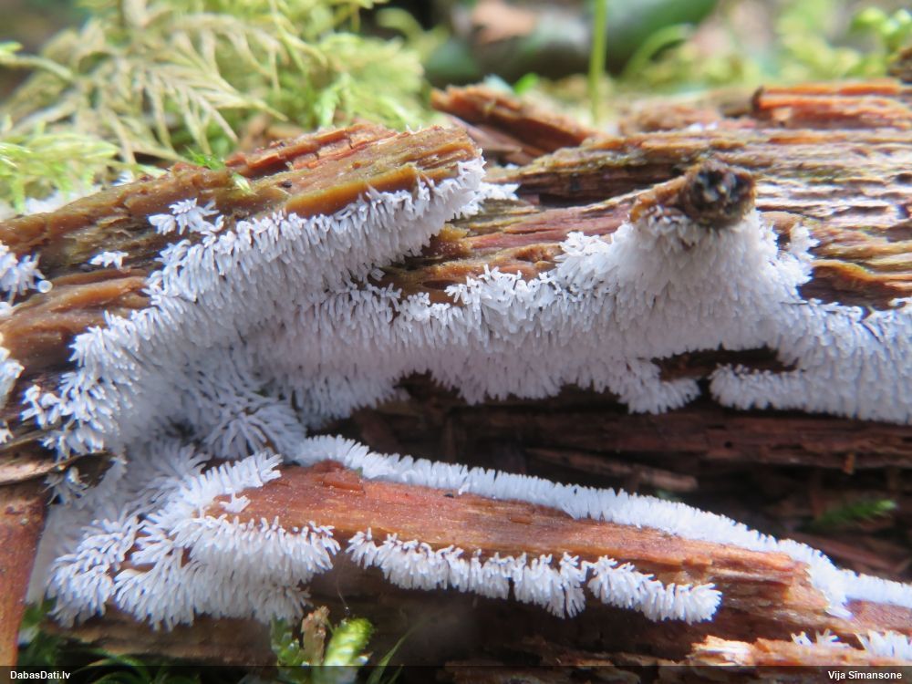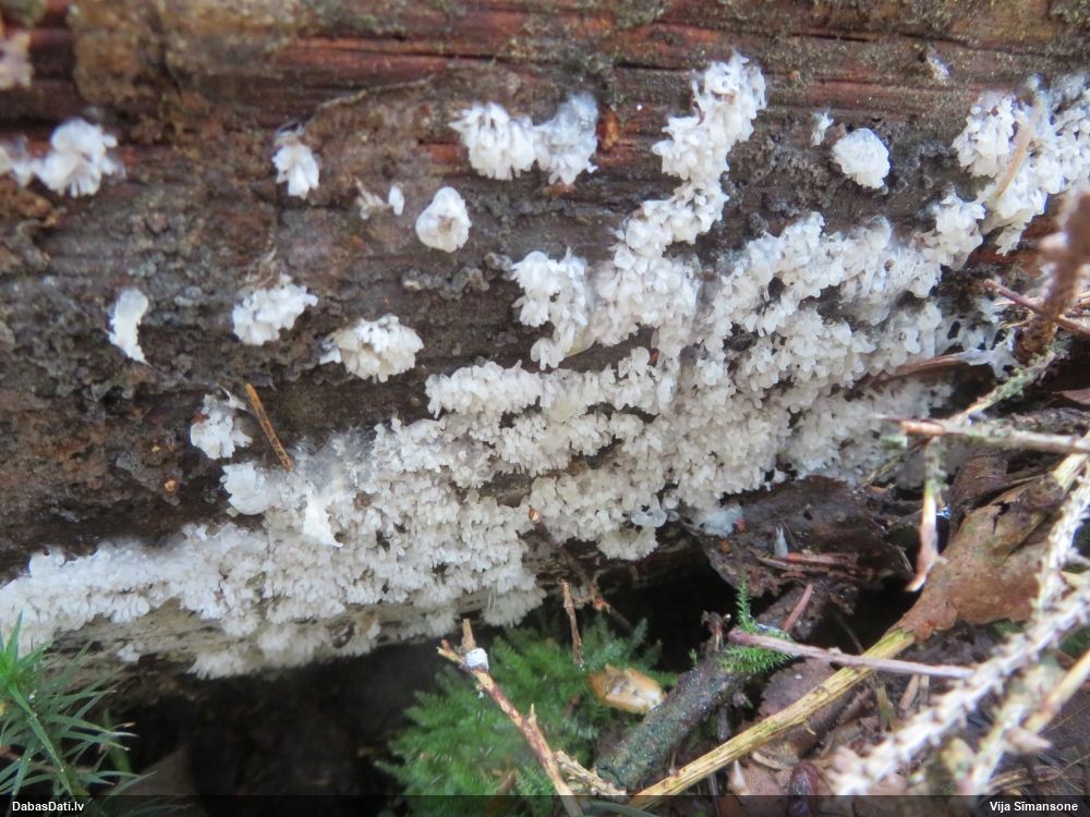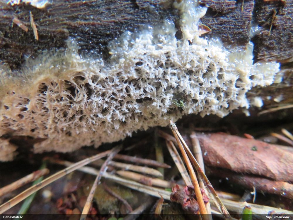Šim Vijas paraugam iekšas precīzi tādas pašas - baltdzeltenas, ar kapilīciju ar maziem mezgliem, un virsma balta. Sporas gan lielākas: https://dabasdati.lv/lv/observation/b146f03a39b8789e2897007d9e464255/
