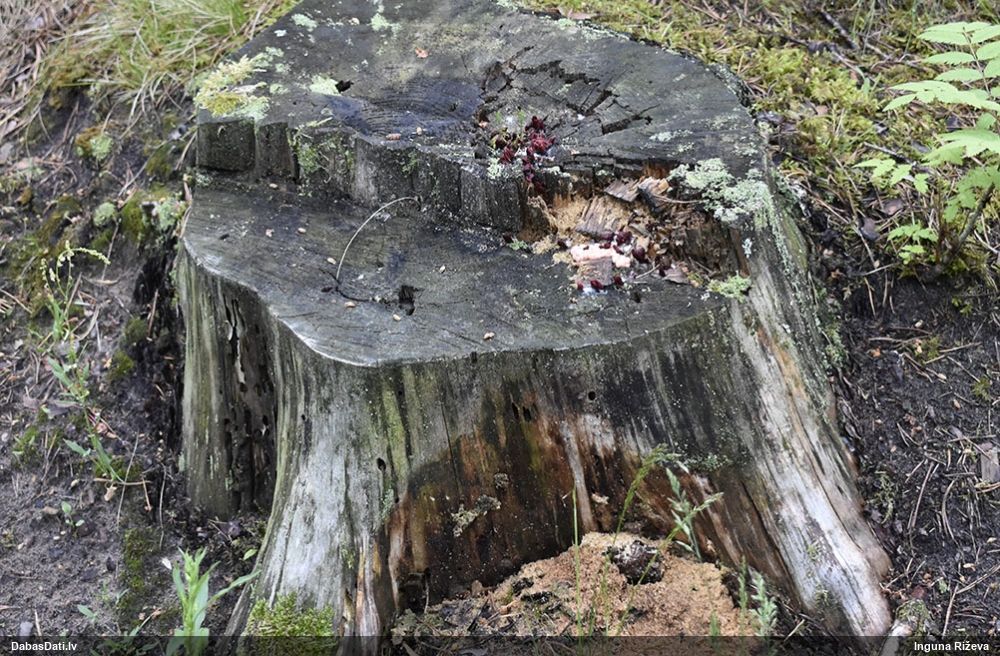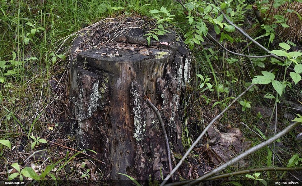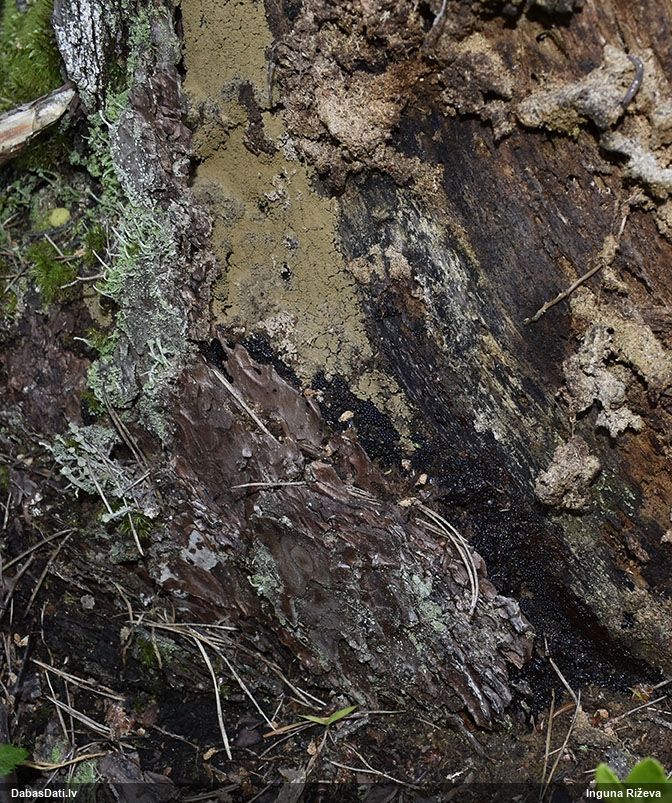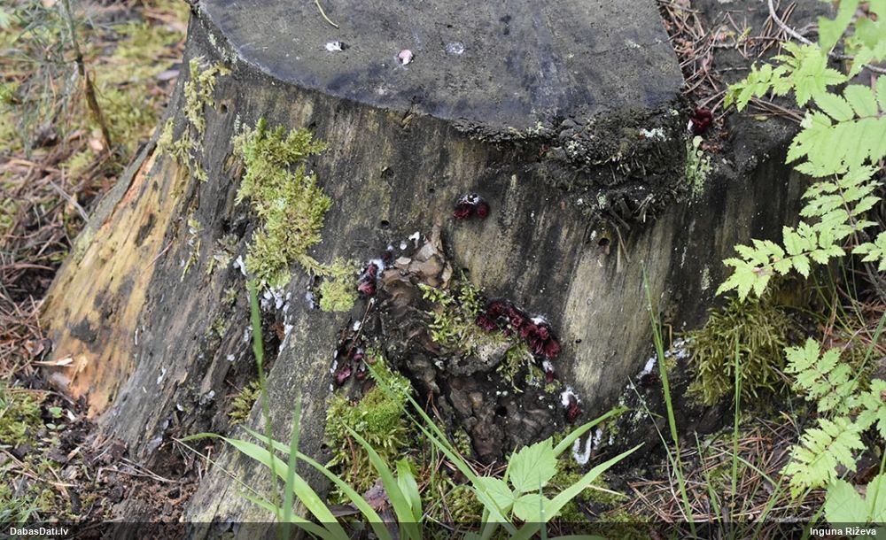 Skujkoks nav par tuvumā. Ir tikai lapu koki - lazda, kastanis, ābelītes. Otrpus celmam (D pusē) lejasdaļā, ko pamanīju pirmo, arī bija kaut kas no šim līdzīga, bet tik izsporojies, ka palicis tikai paliels brūns sporu pleķis. Intriga pavērot nākamgad.