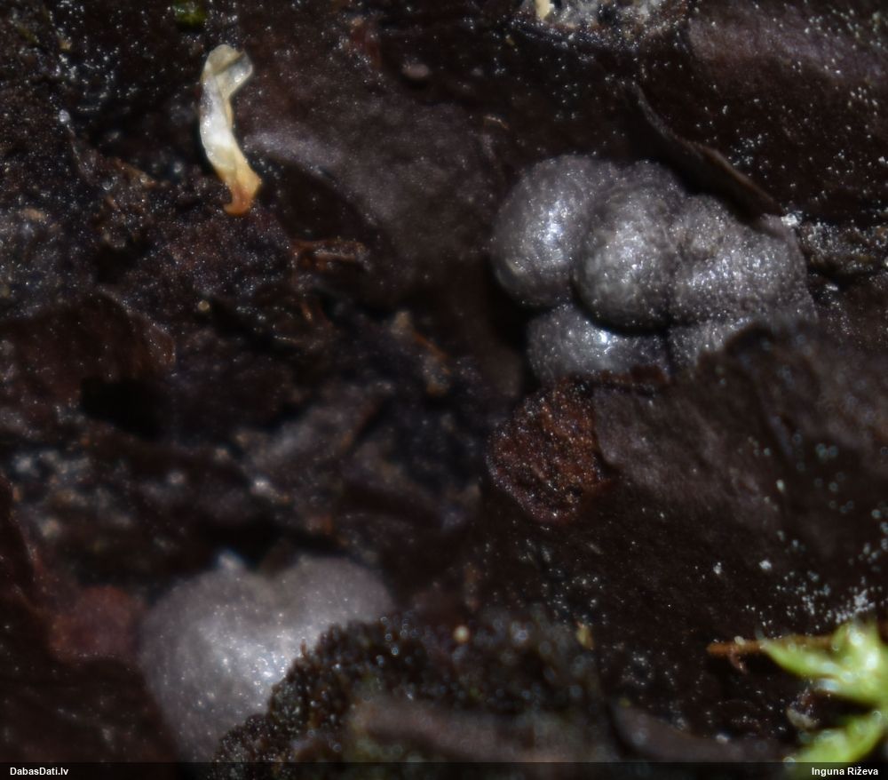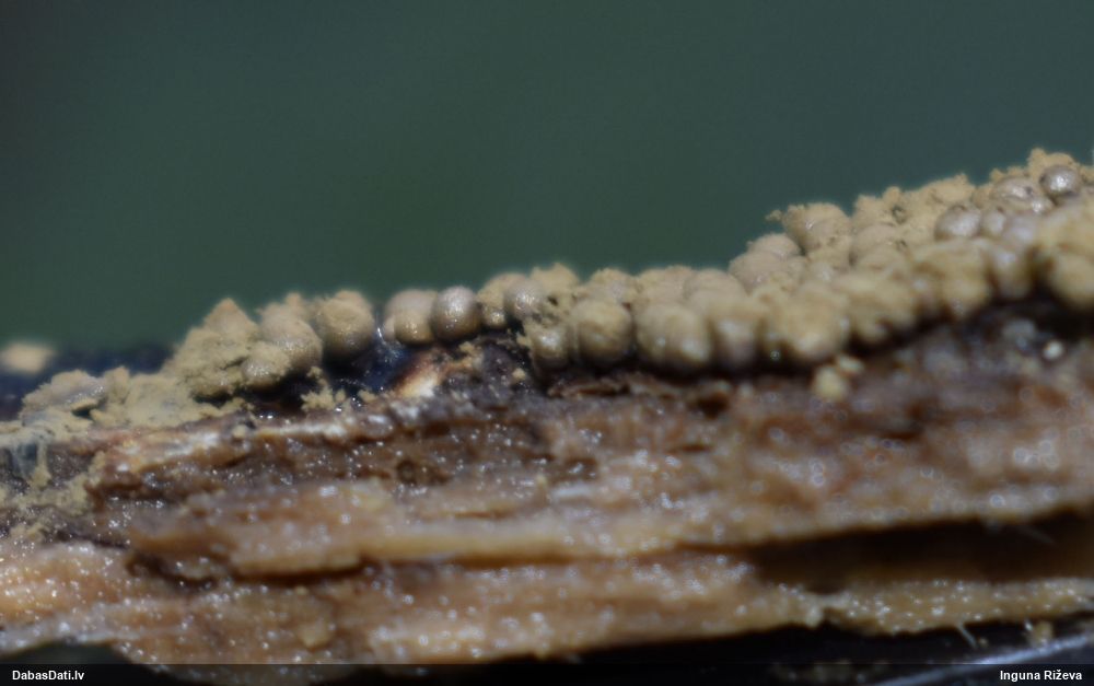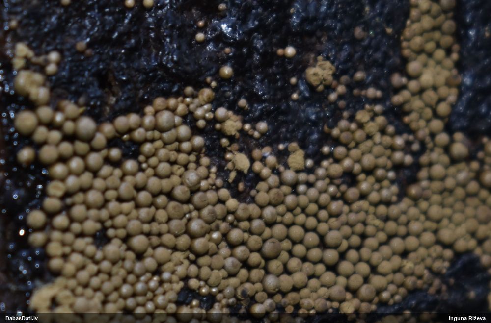 Ļoti ļoti labs atradums! Šo varētu likt aizsargājamo sugu sarakstā, jo pasaulē reti ziņota, Latvijā tikai izcilās vietās atrasta. Par laimi, paraugā bija arī nobrieduši eksemplāri, kam sporu mākonis knapi turējās klāt - un tā ir arī raksturīga sugas pazīme. Bet visuzskatāmākais te ir sporu virsmas raksts, tāpēc te svarīgi redzēt sporas vislielākajā palielinājumā.