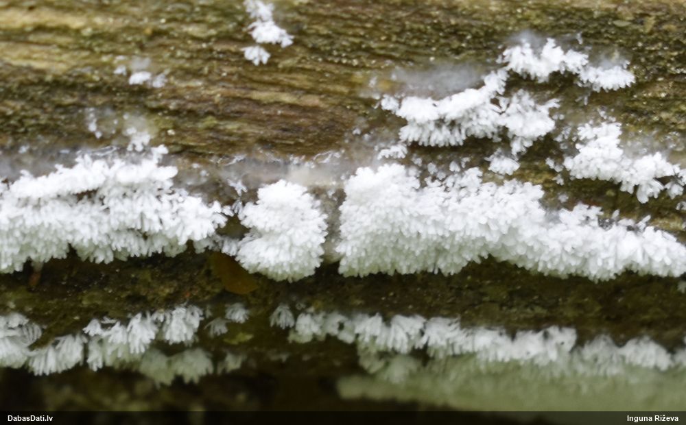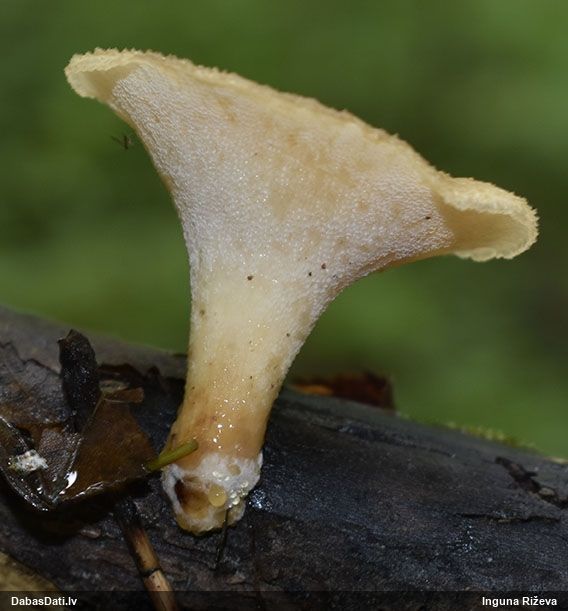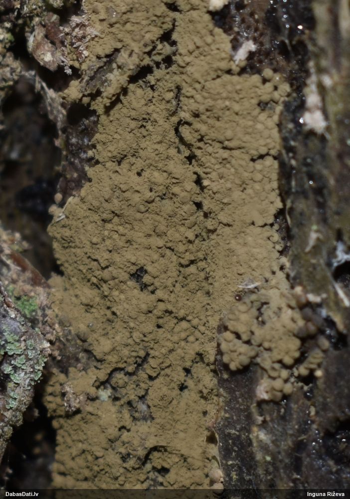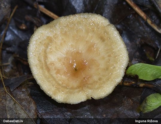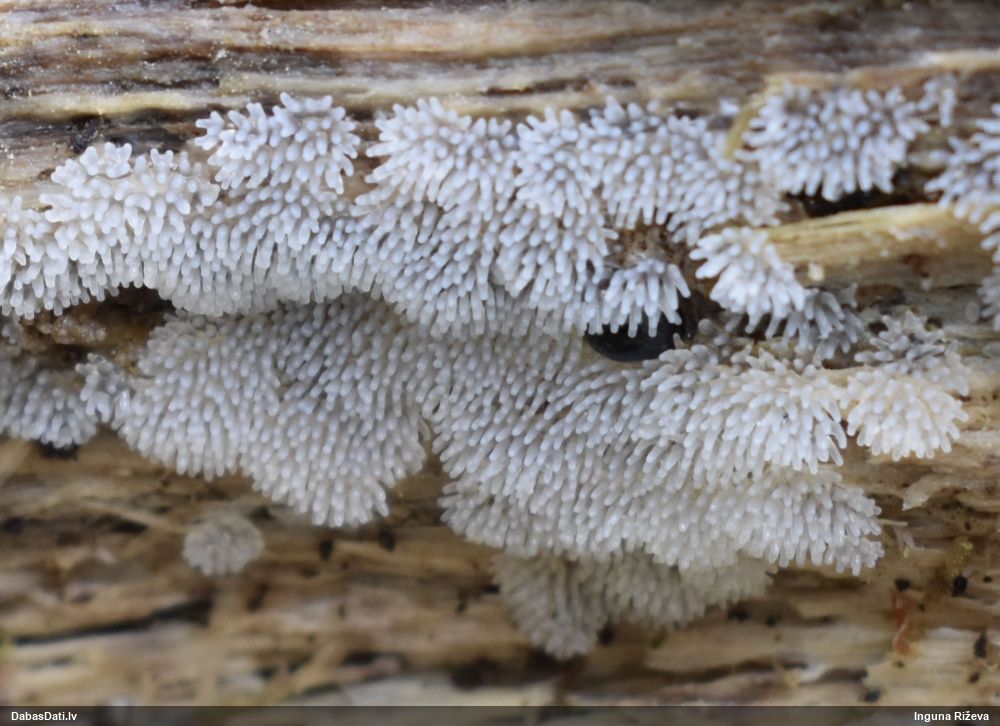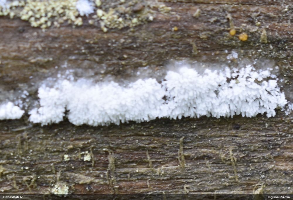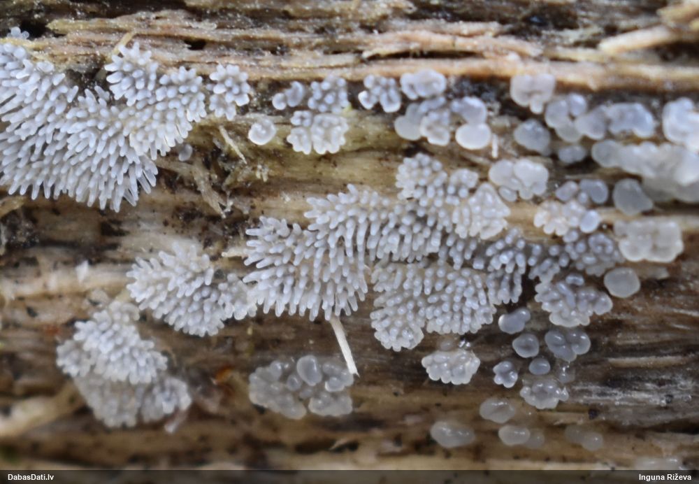 Šim Vijas paraugam iekšas precīzi tādas pašas - baltdzeltenas, ar kapilīciju ar maziem mezgliem, un virsma balta. Sporas gan lielākas: https://dabasdati.lv/lv/observation/b146f03a39b8789e2897007d9e464255/
