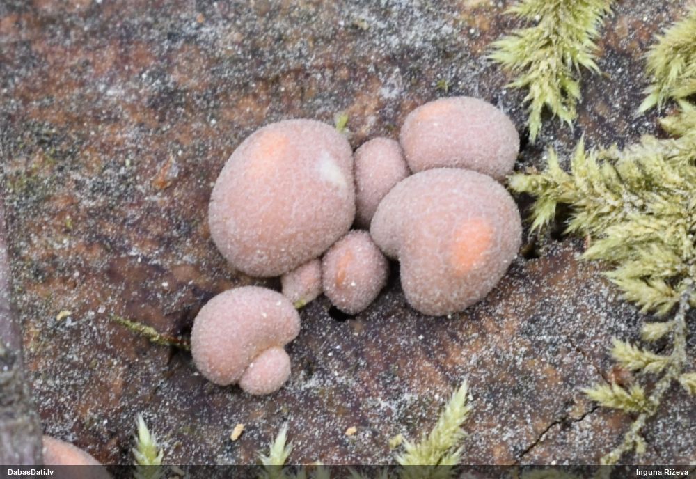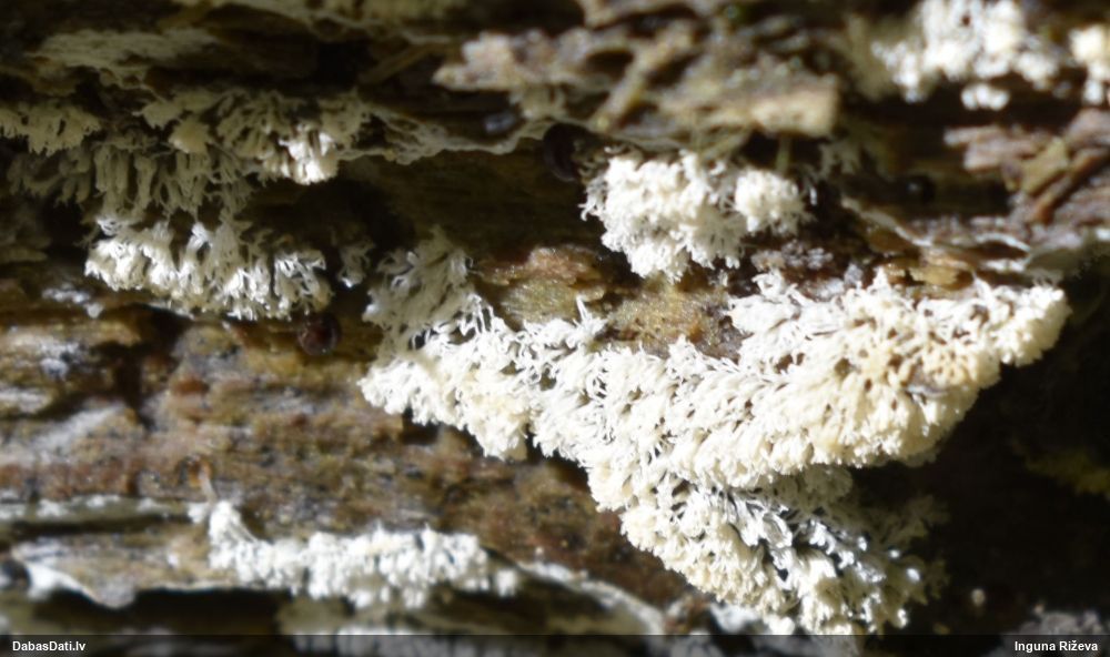 Šim Vijas paraugam iekšas precīzi tādas pašas - baltdzeltenas, ar kapilīciju ar maziem mezgliem, un virsma balta. Sporas gan lielākas: https://dabasdati.lv/lv/observation/b146f03a39b8789e2897007d9e464255/