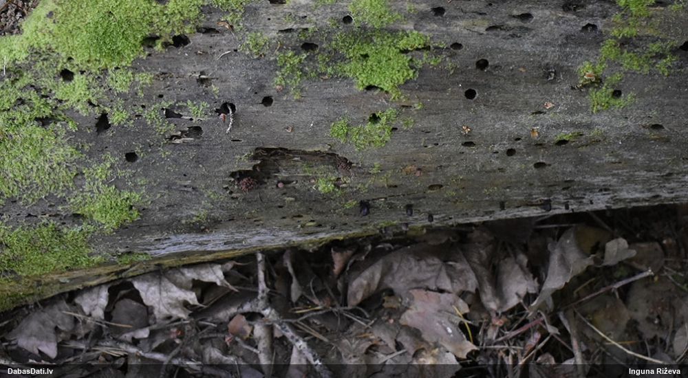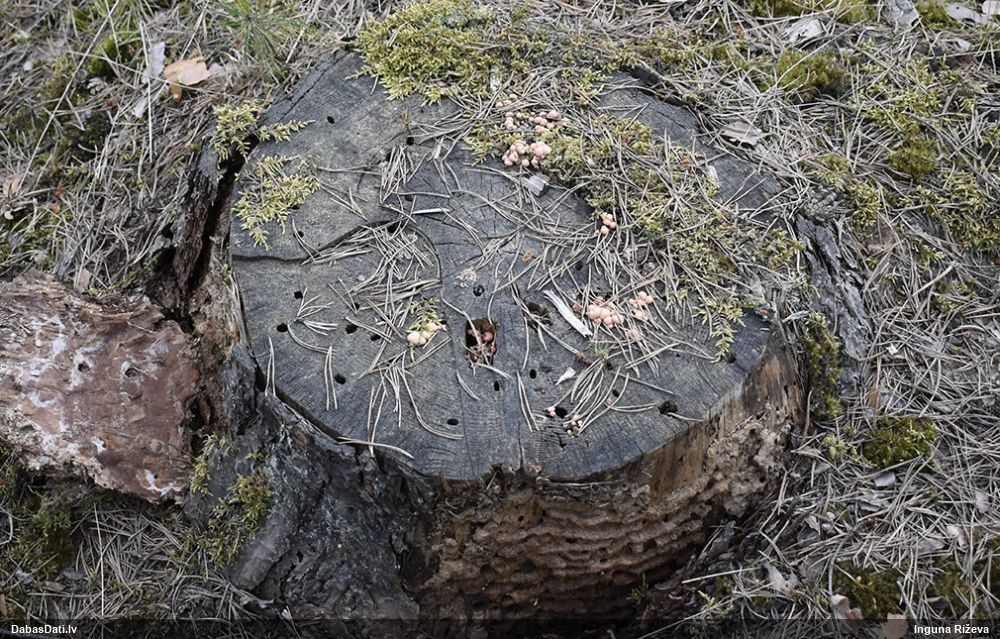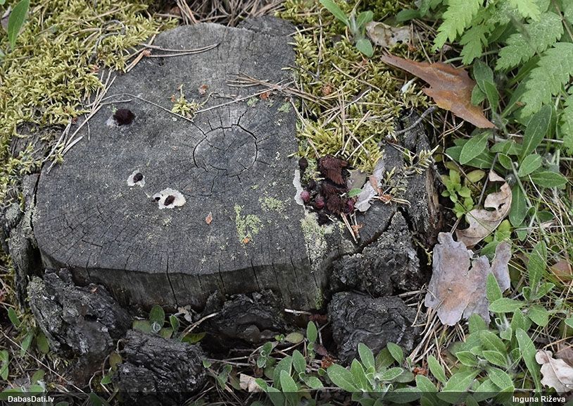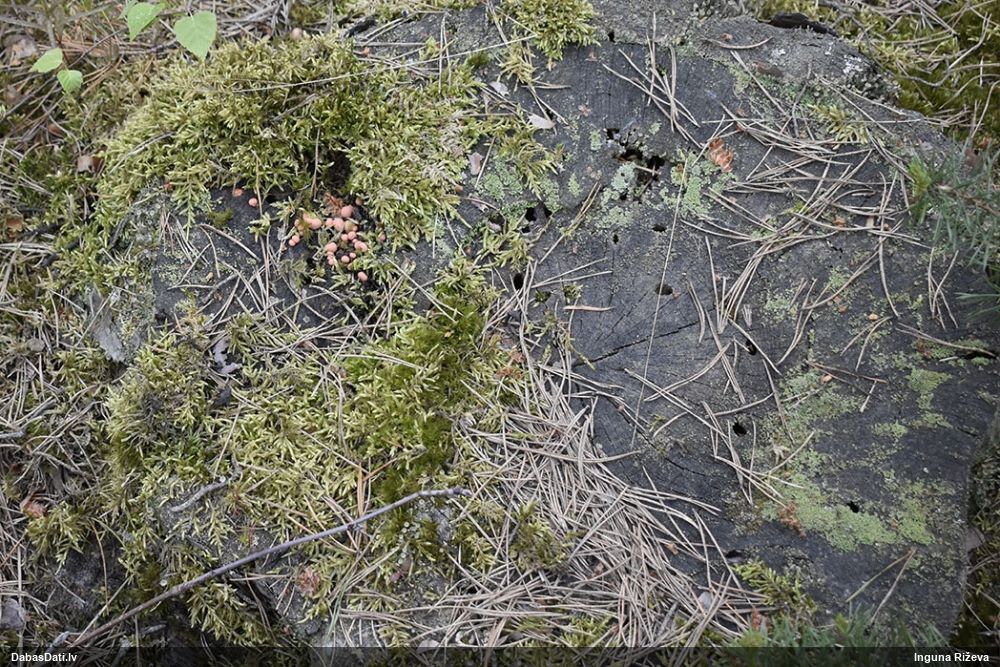 Skujkoks nav par tuvumā. Ir tikai lapu koki - lazda, kastanis, ābelītes. Otrpus celmam (D pusē) lejasdaļā, ko pamanīju pirmo, arī bija kaut kas no šim līdzīga, bet tik izsporojies, ka palicis tikai paliels brūns sporu pleķis. Intriga pavērot nākamgad.