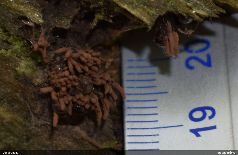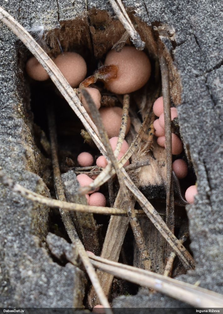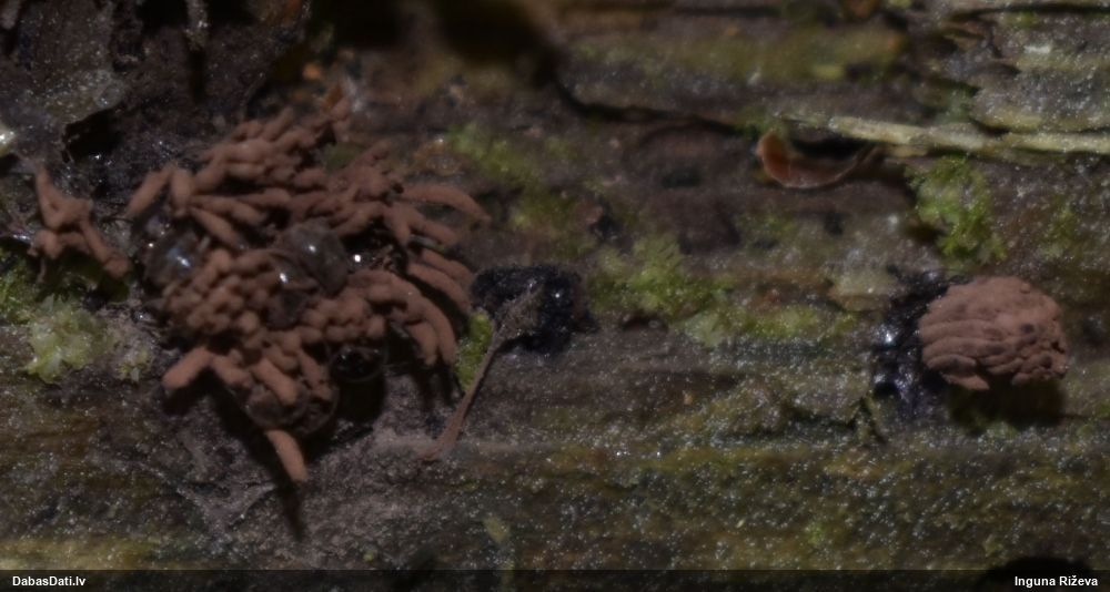 Hmm, nepievērsu tam uzmanību, bet tas interesanti, paldies! Vispār izskatās pēc vālenītes, ne kūlītes, speciāli salīdzināju aprakstus ar Stemonitis splendens, bet mikroskopiski tomēr atbilst visām kūlītes pazīmēm, un abas mikroskopētās kūlītes - vienādas. Tur kāds skujkoks blakus neaug?