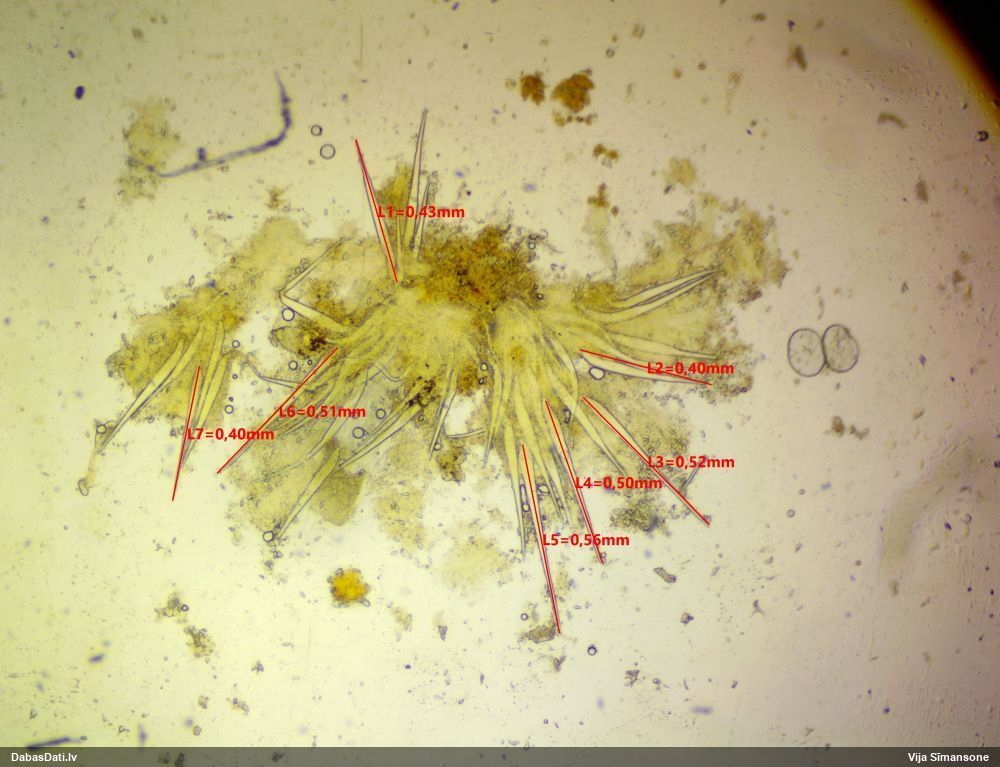 Nemikroskopēju, tikai vizuāli apskatīju. Ja kaut kad pētīšu šo sugu grupu, tad mikroskopiski pārbaudīšu.