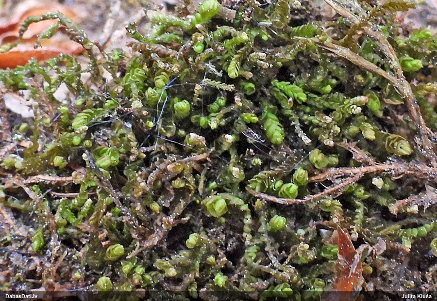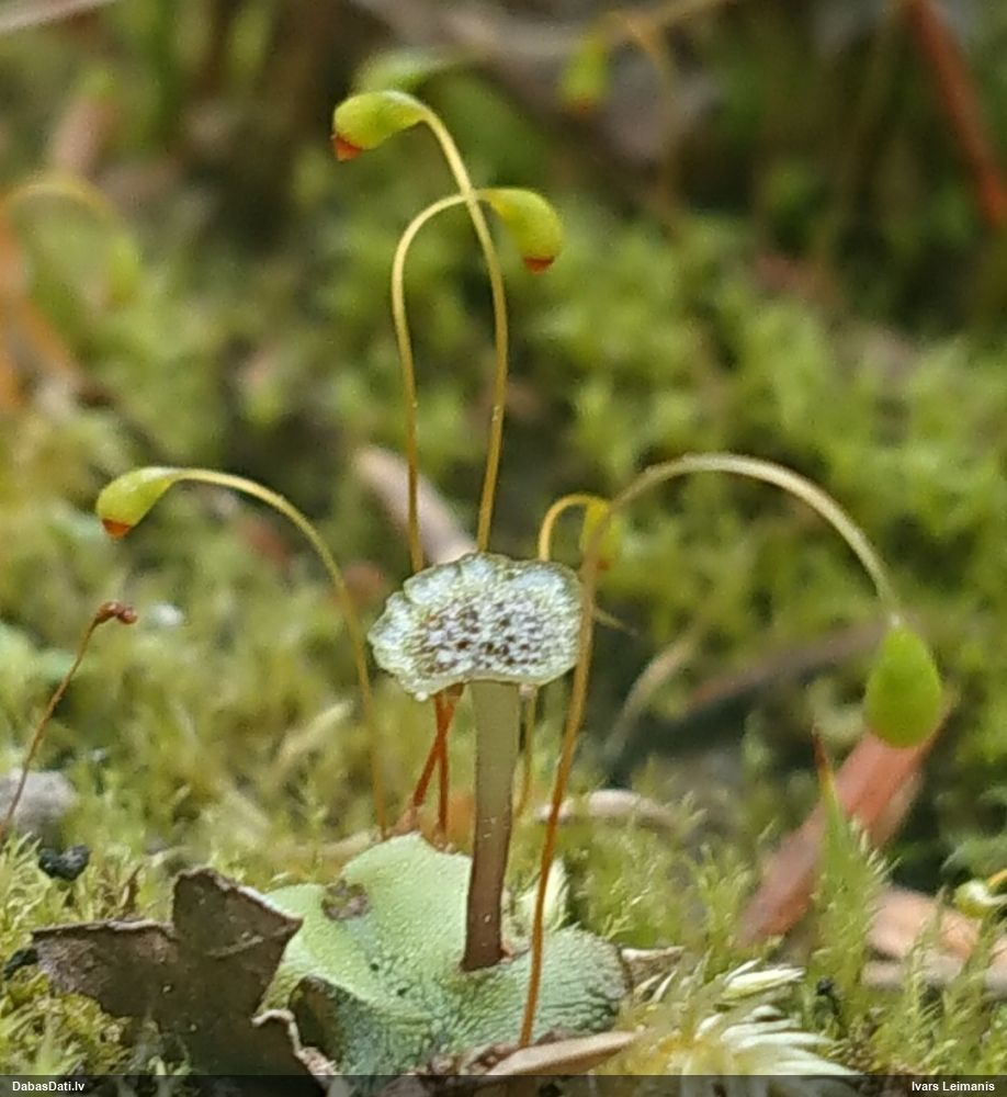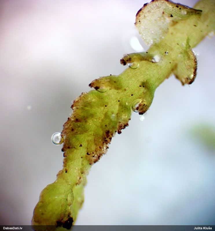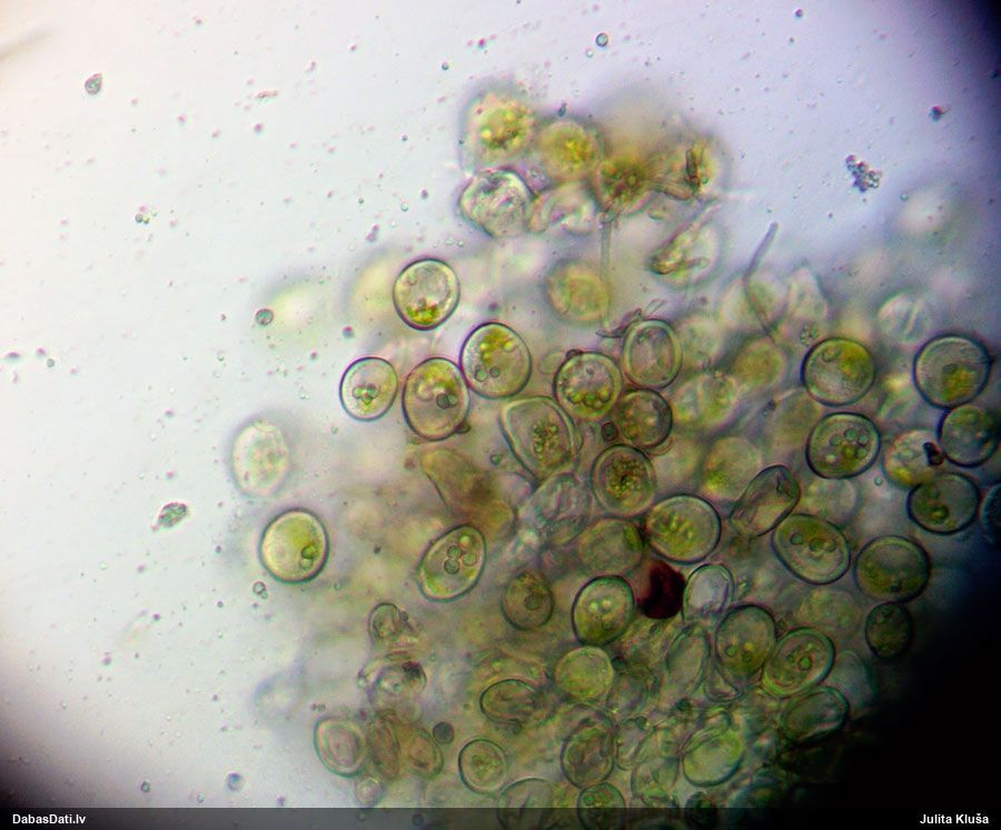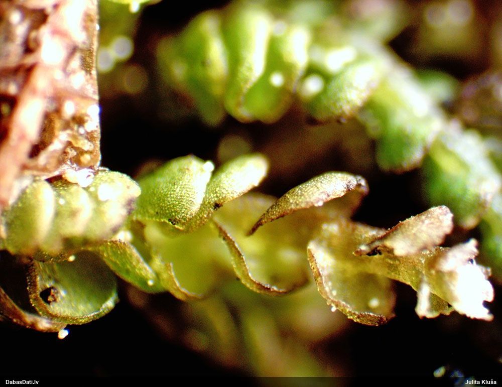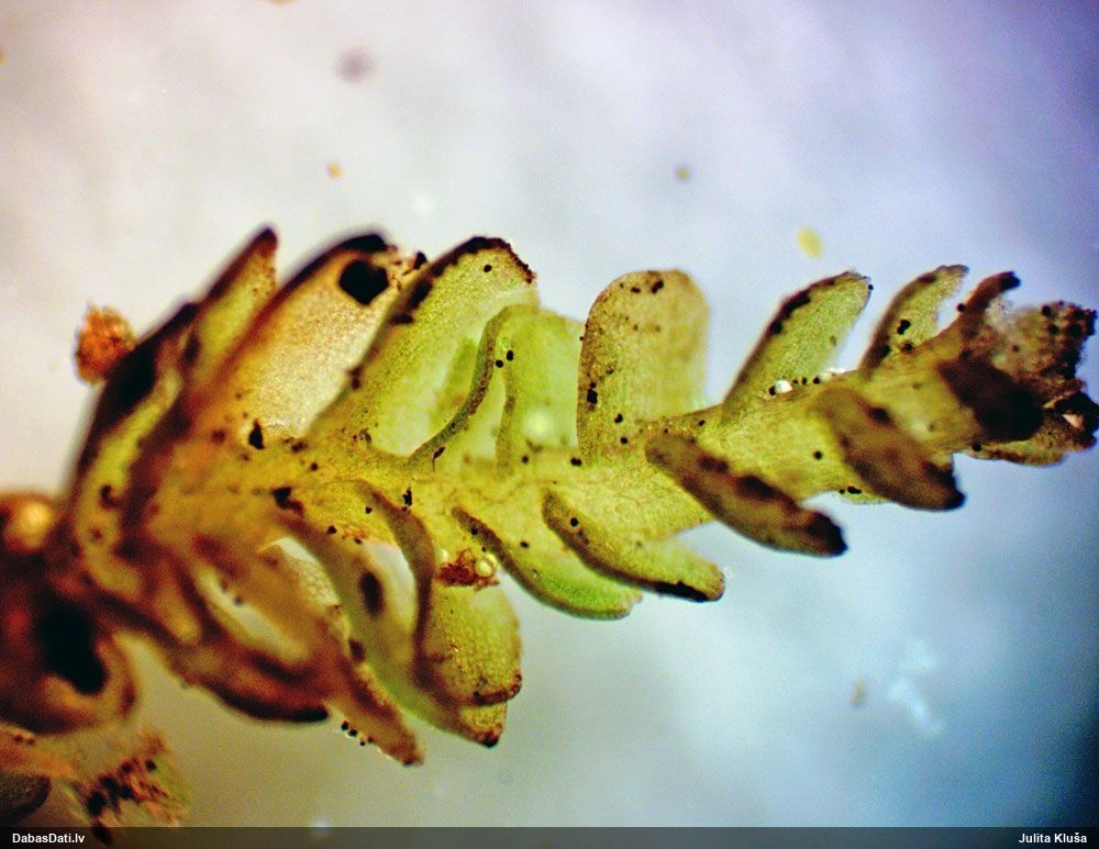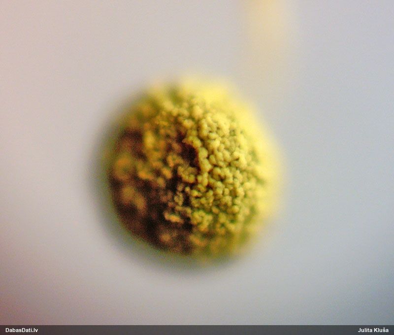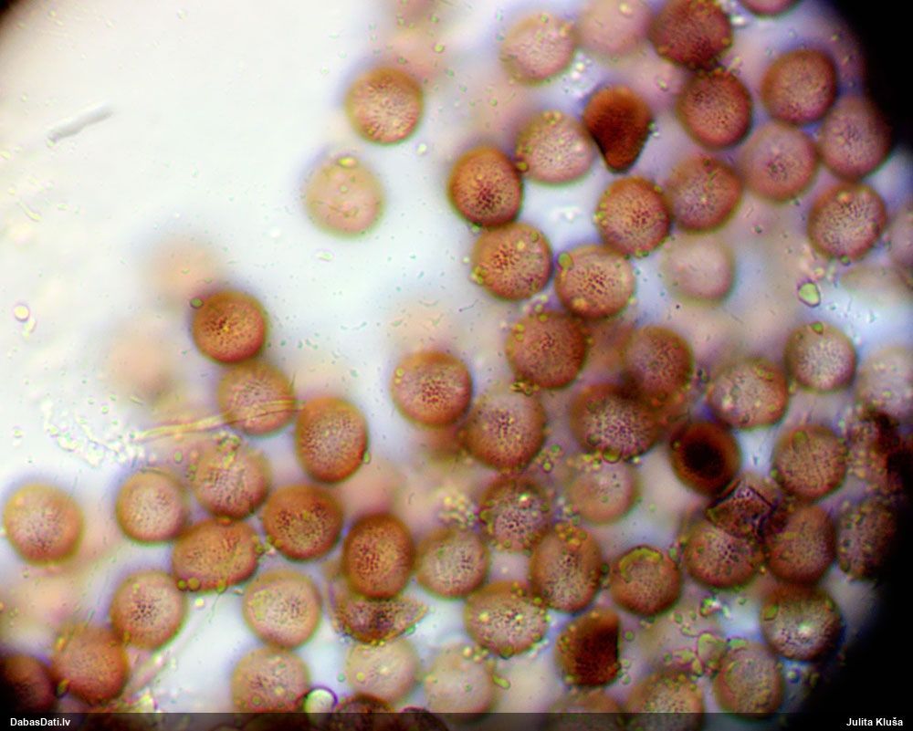 Ļoti ļoti labs atradums! Šo varētu likt aizsargājamo sugu sarakstā, jo pasaulē reti ziņota, Latvijā tikai izcilās vietās atrasta. Par laimi, paraugā bija arī nobrieduši eksemplāri, kam sporu mākonis knapi turējās klāt - un tā ir arī raksturīga sugas pazīme. Bet visuzskatāmākais te ir sporu virsmas raksts, tāpēc te svarīgi redzēt sporas vislielākajā palielinājumā.