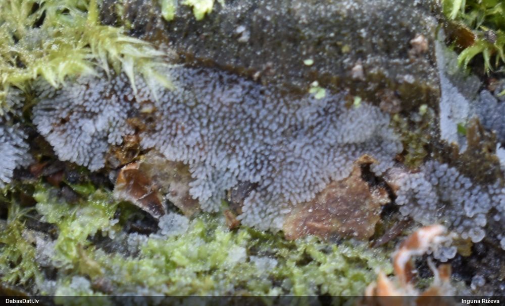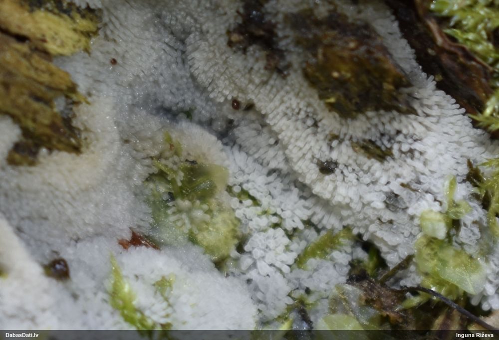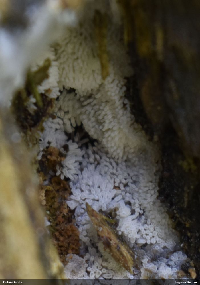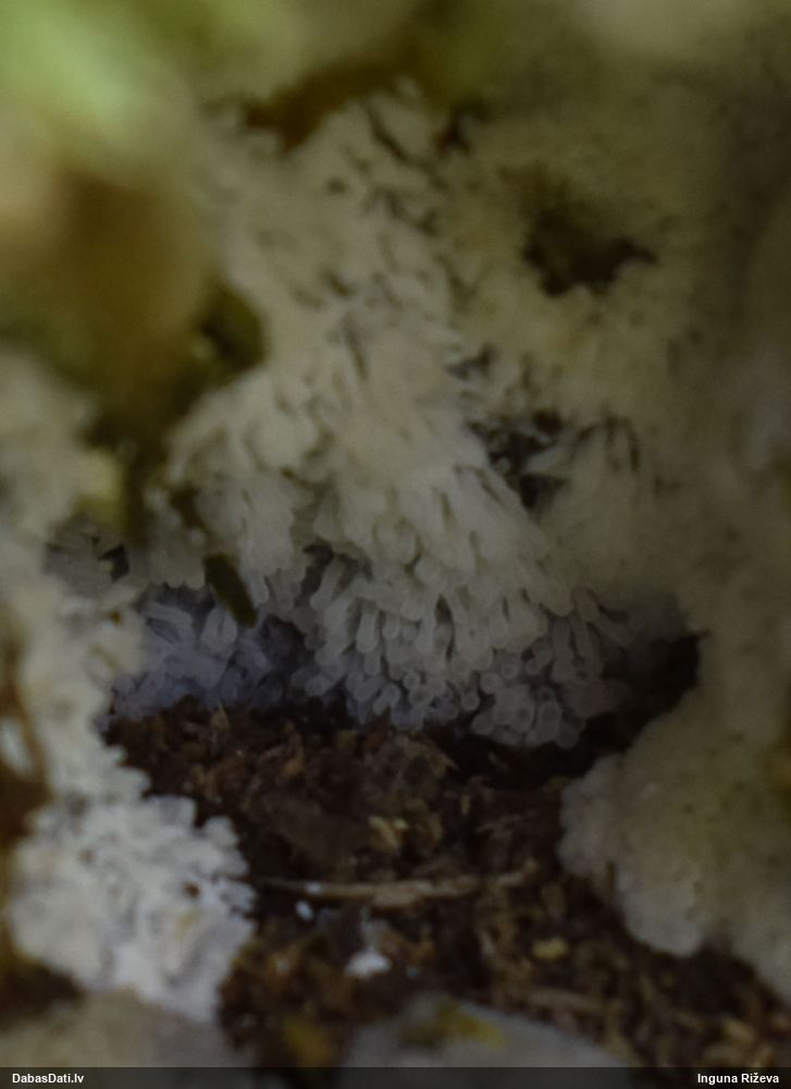 Šim Vijas paraugam iekšas precīzi tādas pašas - baltdzeltenas, ar kapilīciju ar maziem mezgliem, un virsma balta. Sporas gan lielākas: https://dabasdati.lv/lv/observation/b146f03a39b8789e2897007d9e464255/