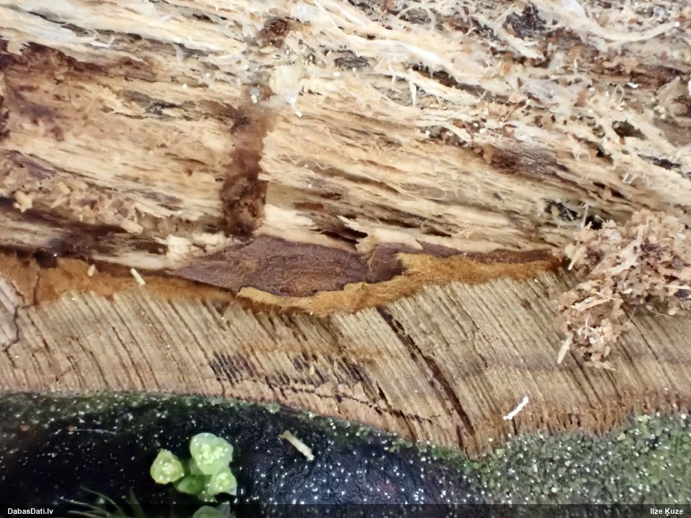 Skujkoks nav par tuvumā. Ir tikai lapu koki - lazda, kastanis, ābelītes. Otrpus celmam (D pusē) lejasdaļā, ko pamanīju pirmo, arī bija kaut kas no šim līdzīga, bet tik izsporojies, ka palicis tikai paliels brūns sporu pleķis. Intriga pavērot nākamgad.