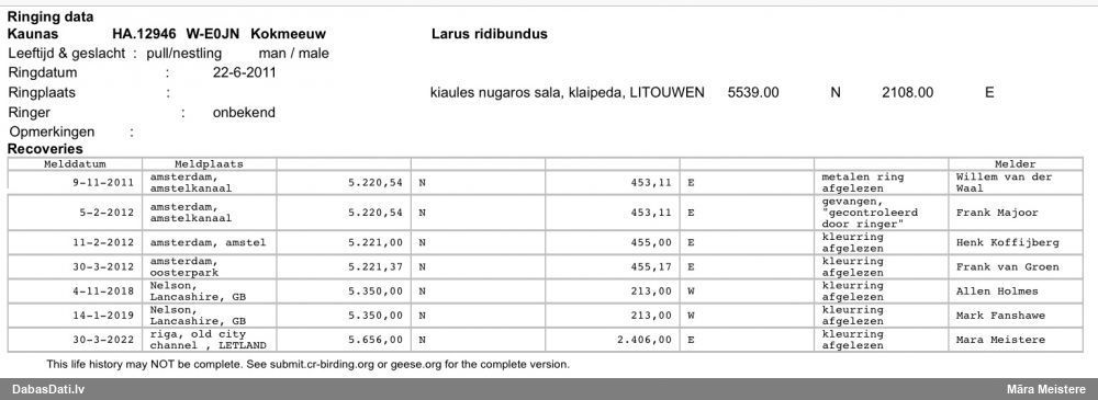 Krāsu gredzens: 085T Dzimums: male Vecums: adult Gredzenošanas datums: 09.01.2025 Gredzenošanas vieta: Dohren, Germany Krāsu gredzens: 319E Dzimums: female Vecums: 2y Gredzenošanas datums: 07.01.2020 Gredzenošanas vieta: Loosbroek, Noord-Brabant, Netherlands Krāsu gredzens: 034T transmiter Dzimums: female Vecums: adult Gredzenošanas datums: 16.12.2021 Gredzenošanas vieta: Groß Fullen, Emsland, Germany Krāsu gredzens: 069T transmiter Vecums: 3y Gredzenošanas datums: 09.01.2025 Atrašanas datums: 24.11.2025 Gredzenošanas vieta: Dohren, Germany