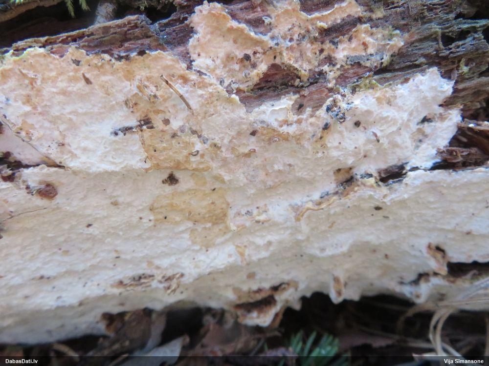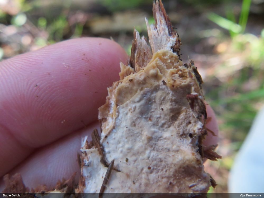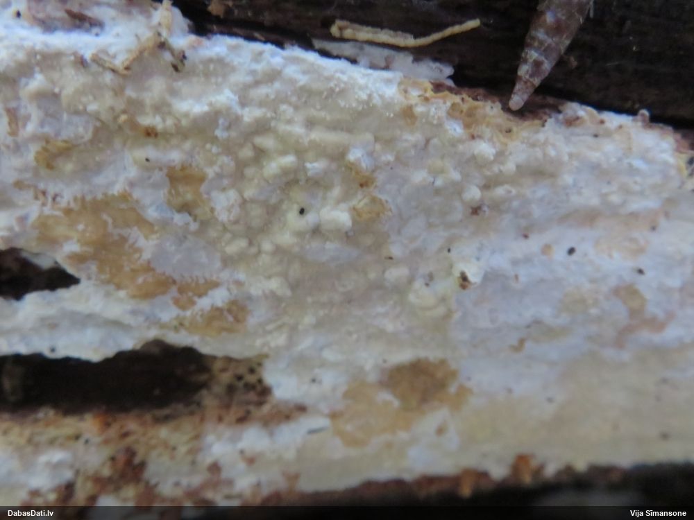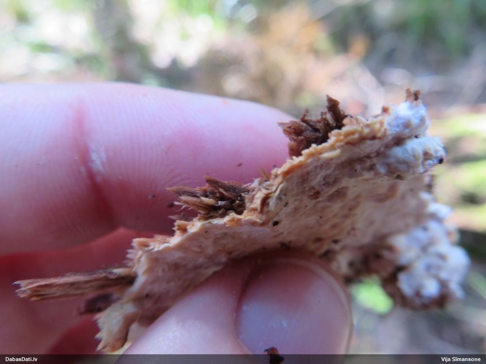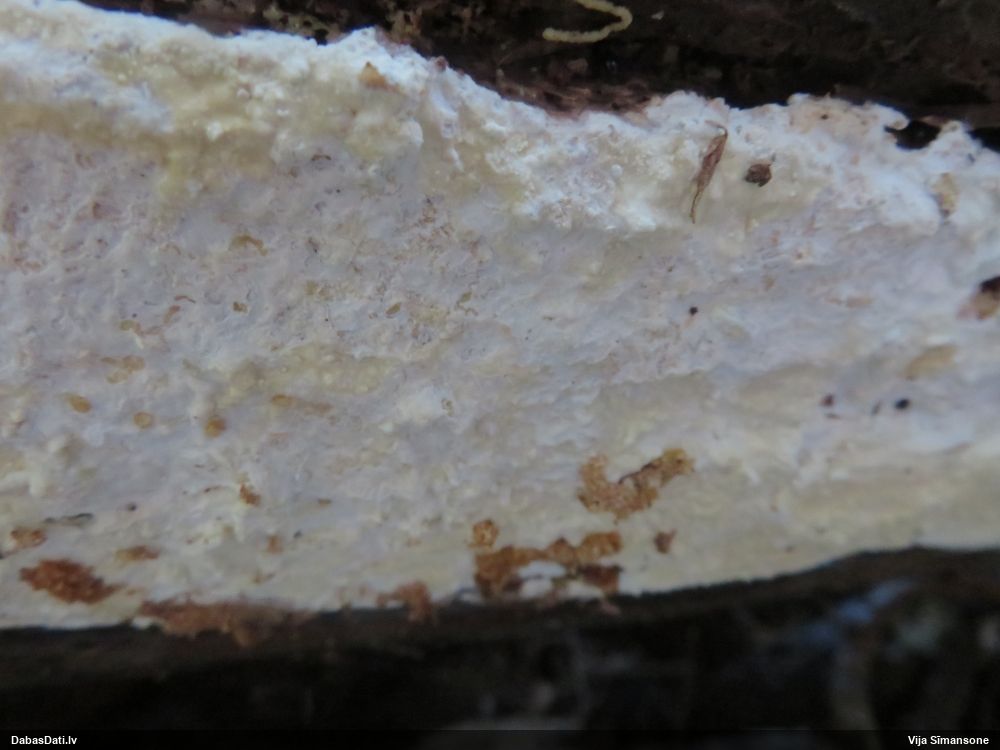 Šim Vijas paraugam iekšas precīzi tādas pašas - baltdzeltenas, ar kapilīciju ar maziem mezgliem, un virsma balta. Sporas gan lielākas: https://dabasdati.lv/lv/observation/b146f03a39b8789e2897007d9e464255/