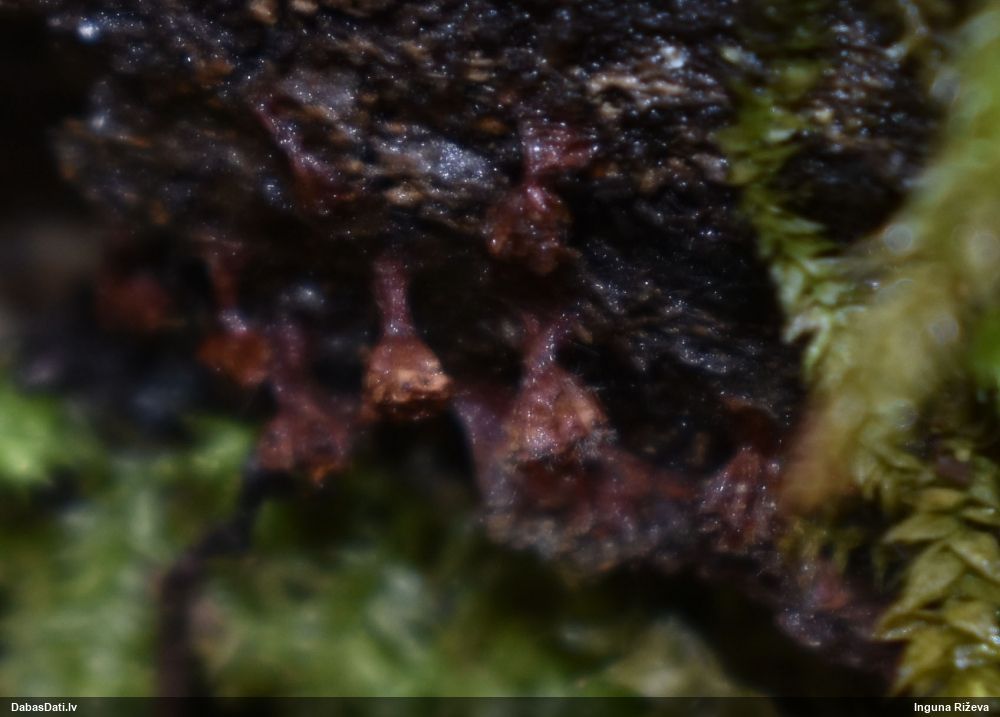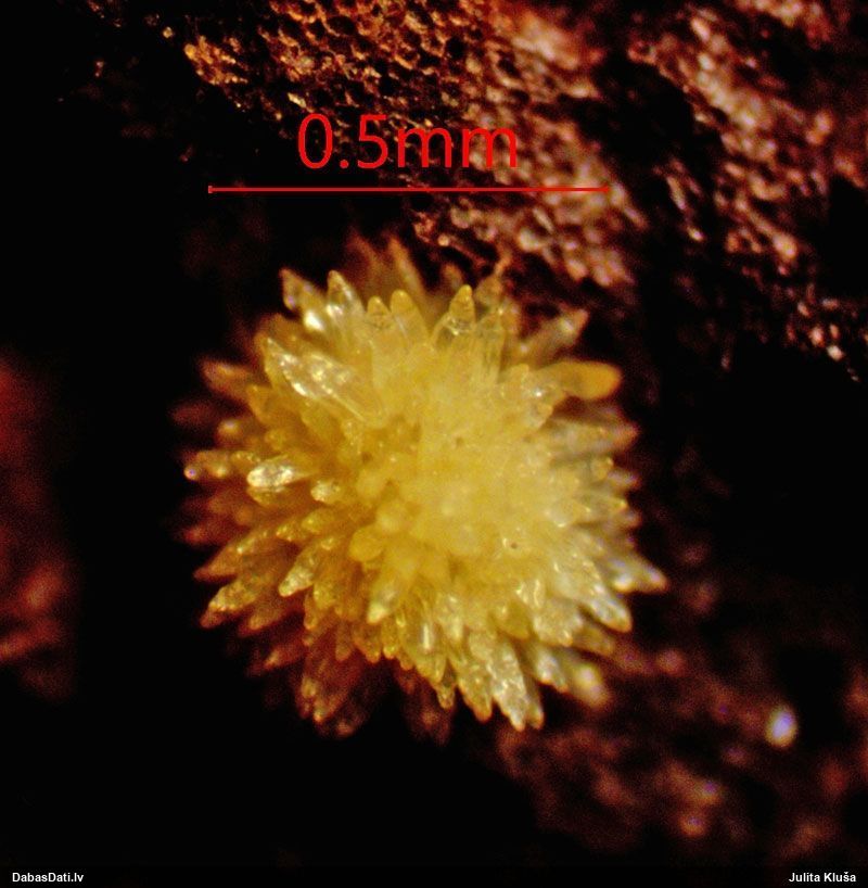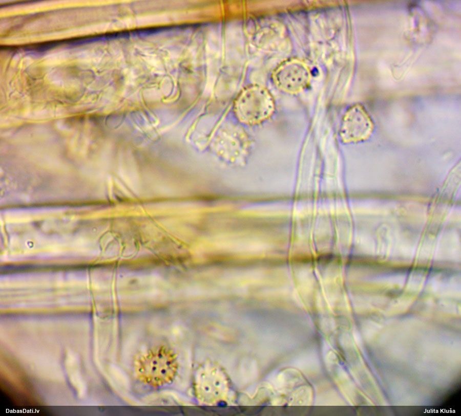 Ļoti ļoti labs atradums! Šo varētu likt aizsargājamo sugu sarakstā, jo pasaulē reti ziņota, Latvijā tikai izcilās vietās atrasta. Par laimi, paraugā bija arī nobrieduši eksemplāri, kam sporu mākonis knapi turējās klāt - un tā ir arī raksturīga sugas pazīme. Bet visuzskatāmākais te ir sporu virsmas raksts, tāpēc te svarīgi redzēt sporas vislielākajā palielinājumā.