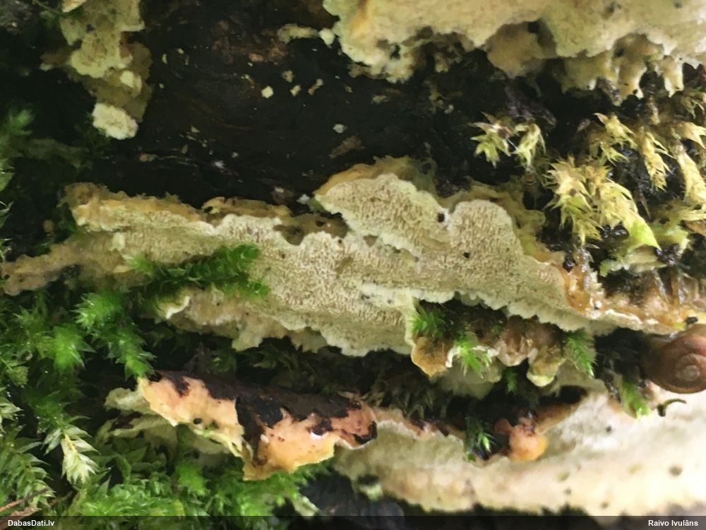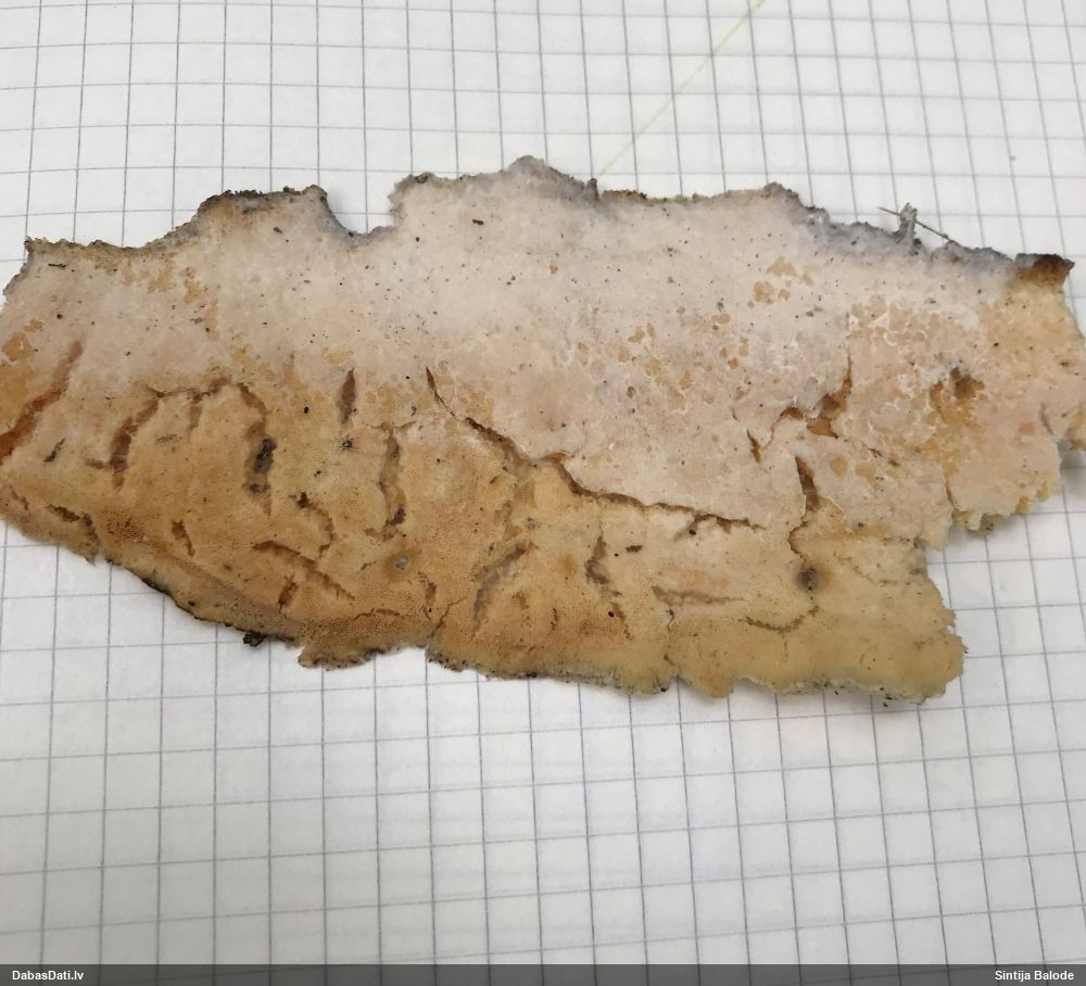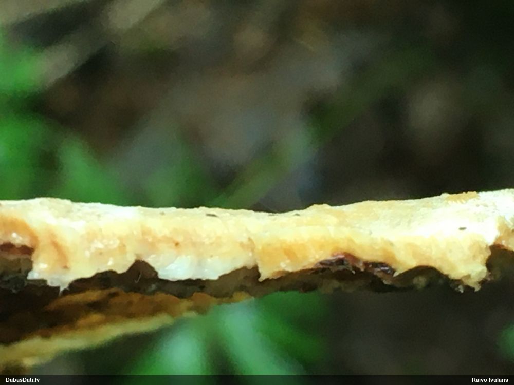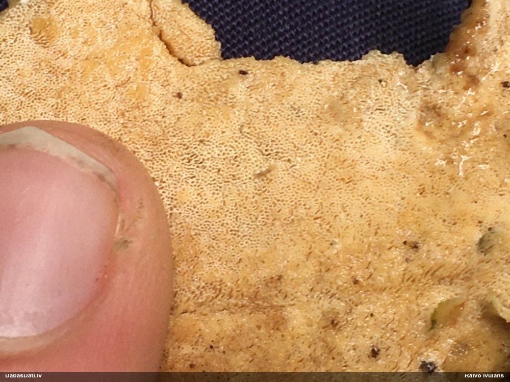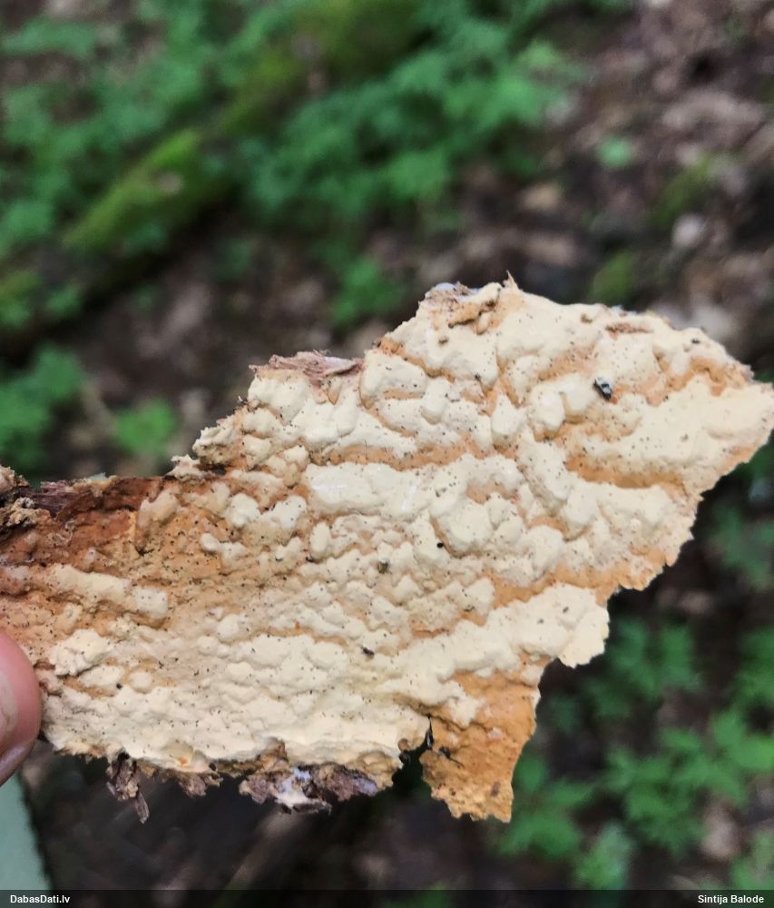 Šim Vijas paraugam iekšas precīzi tādas pašas - baltdzeltenas, ar kapilīciju ar maziem mezgliem, un virsma balta. Sporas gan lielākas: https://dabasdati.lv/lv/observation/b146f03a39b8789e2897007d9e464255/