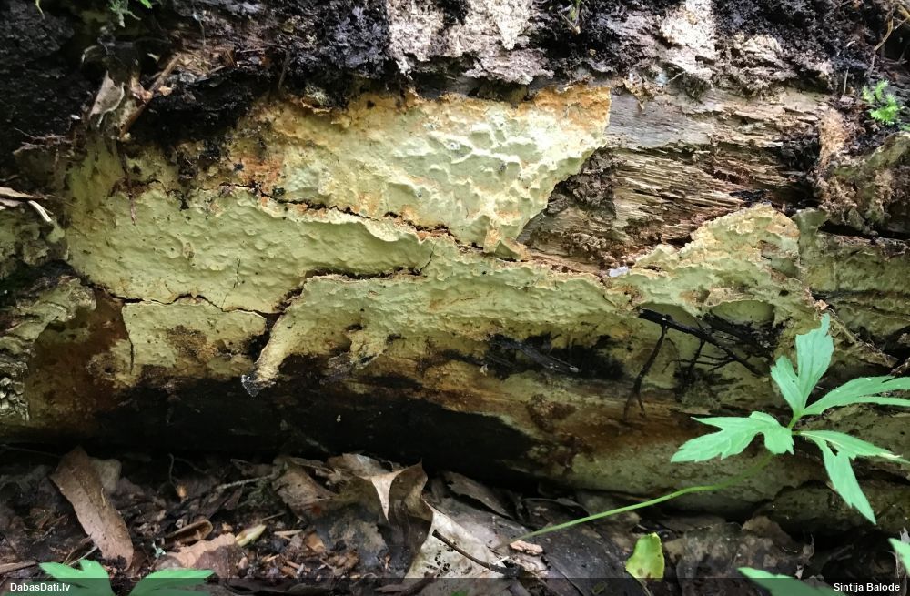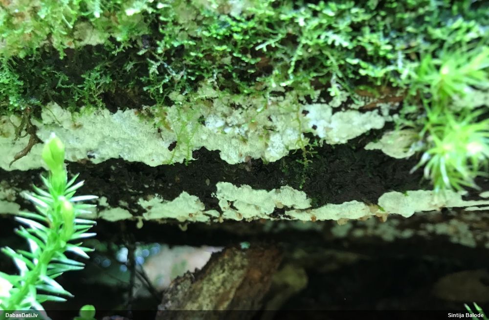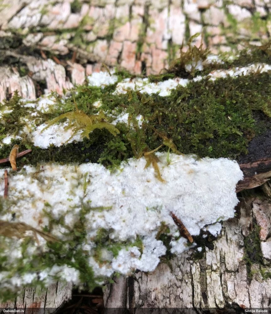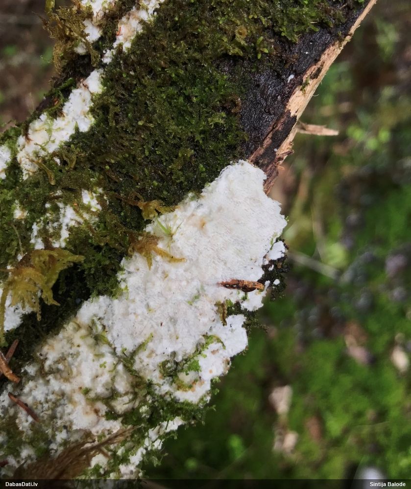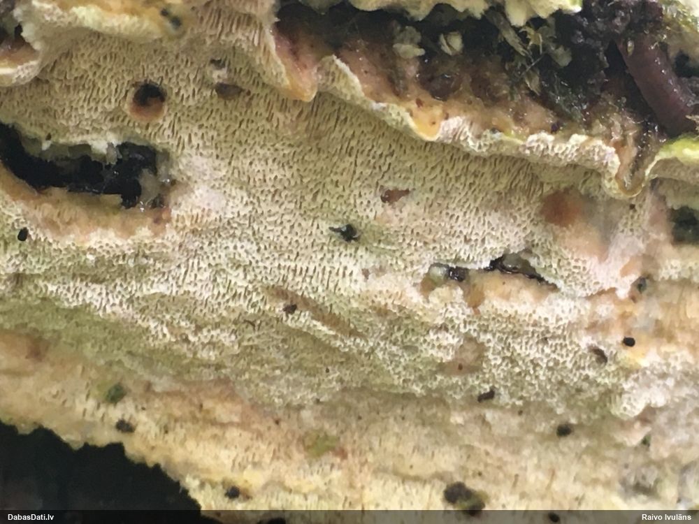 Šim Vijas paraugam iekšas precīzi tādas pašas - baltdzeltenas, ar kapilīciju ar maziem mezgliem, un virsma balta. Sporas gan lielākas: https://dabasdati.lv/lv/observation/b146f03a39b8789e2897007d9e464255/