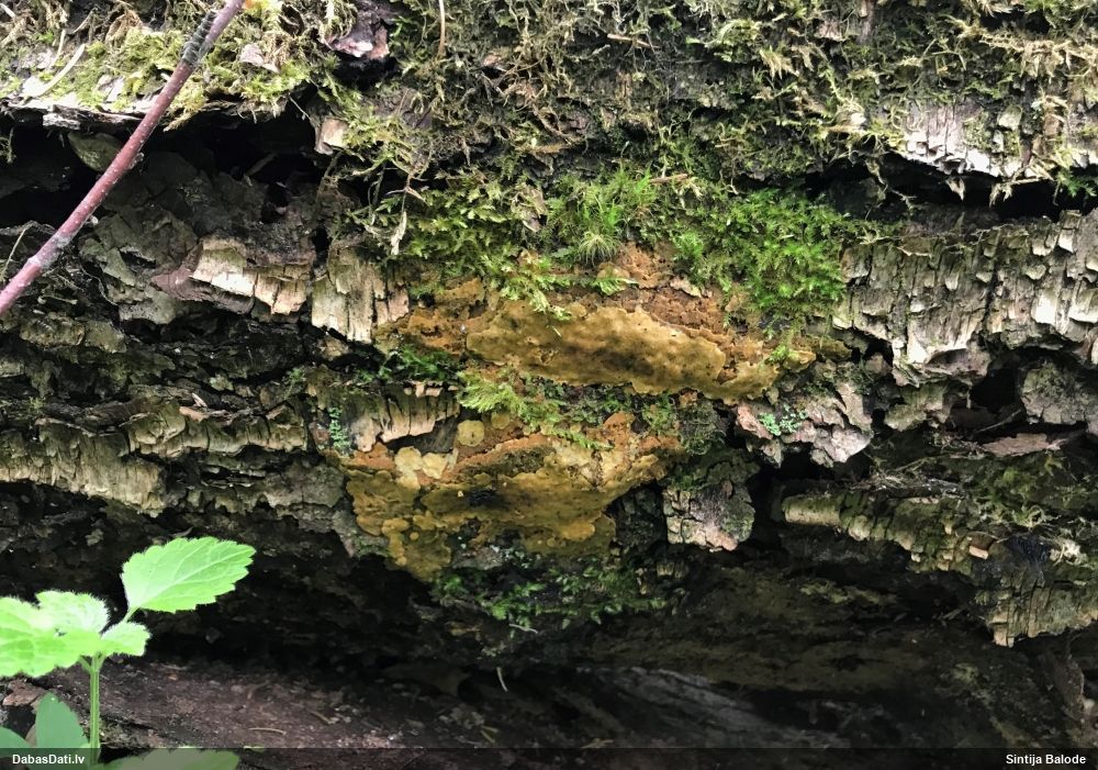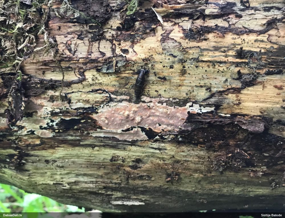 Skujkoks nav par tuvumā. Ir tikai lapu koki - lazda, kastanis, ābelītes. Otrpus celmam (D pusē) lejasdaļā, ko pamanīju pirmo, arī bija kaut kas no šim līdzīga, bet tik izsporojies, ka palicis tikai paliels brūns sporu pleķis. Intriga pavērot nākamgad.