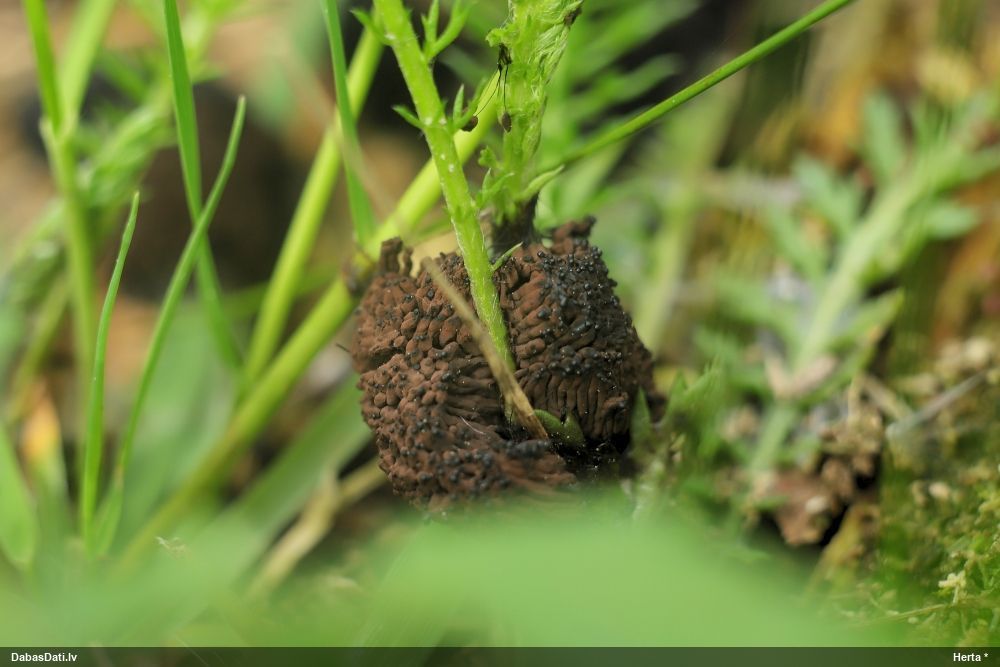Ļoti ļoti labs atradums! Šo varētu likt aizsargājamo sugu sarakstā, jo pasaulē reti ziņota, Latvijā tikai izcilās vietās atrasta. Par laimi, paraugā bija arī nobrieduši eksemplāri, kam sporu mākonis knapi turējās klāt - un tā ir arī raksturīga sugas pazīme. Bet visuzskatāmākais te ir sporu virsmas raksts, tāpēc te svarīgi redzēt sporas vislielākajā palielinājumā.
