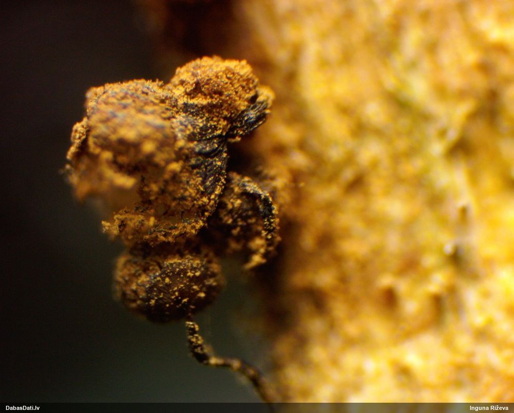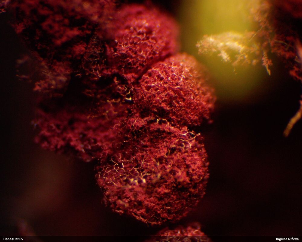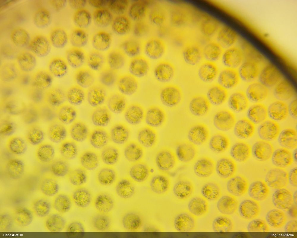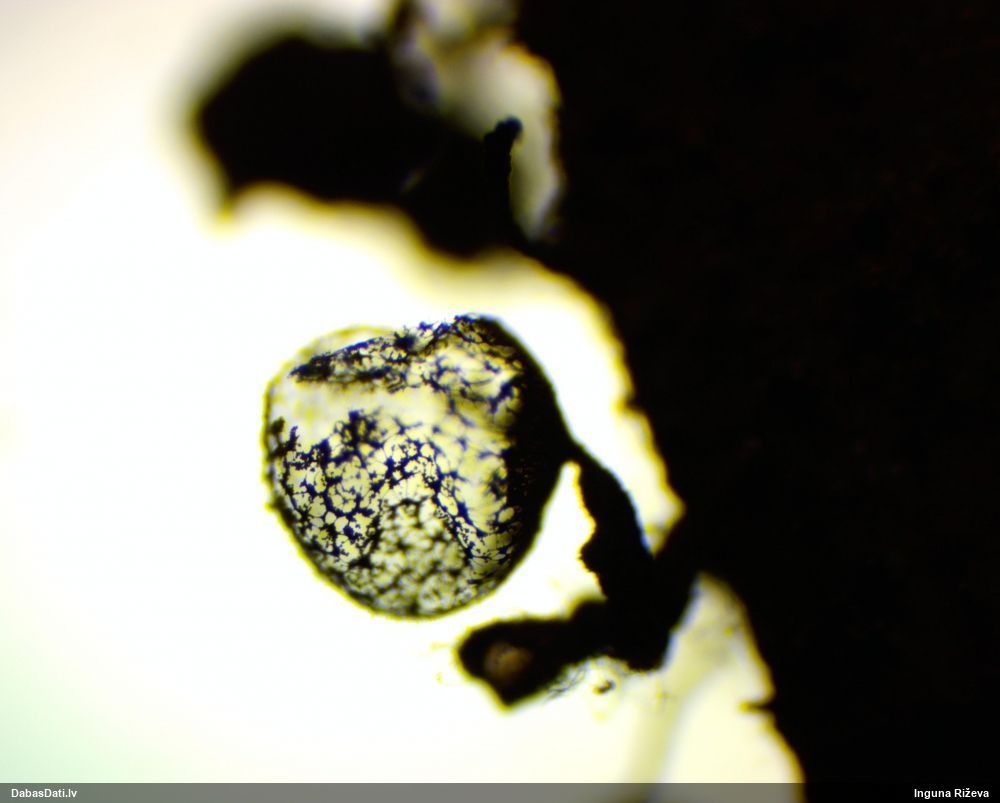 Ļoti ļoti labs atradums! Šo varētu likt aizsargājamo sugu sarakstā, jo pasaulē reti ziņota, Latvijā tikai izcilās vietās atrasta. Par laimi, paraugā bija arī nobrieduši eksemplāri, kam sporu mākonis knapi turējās klāt - un tā ir arī raksturīga sugas pazīme. Bet visuzskatāmākais te ir sporu virsmas raksts, tāpēc te svarīgi redzēt sporas vislielākajā palielinājumā.