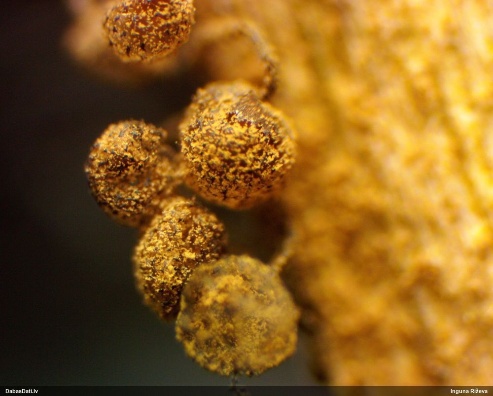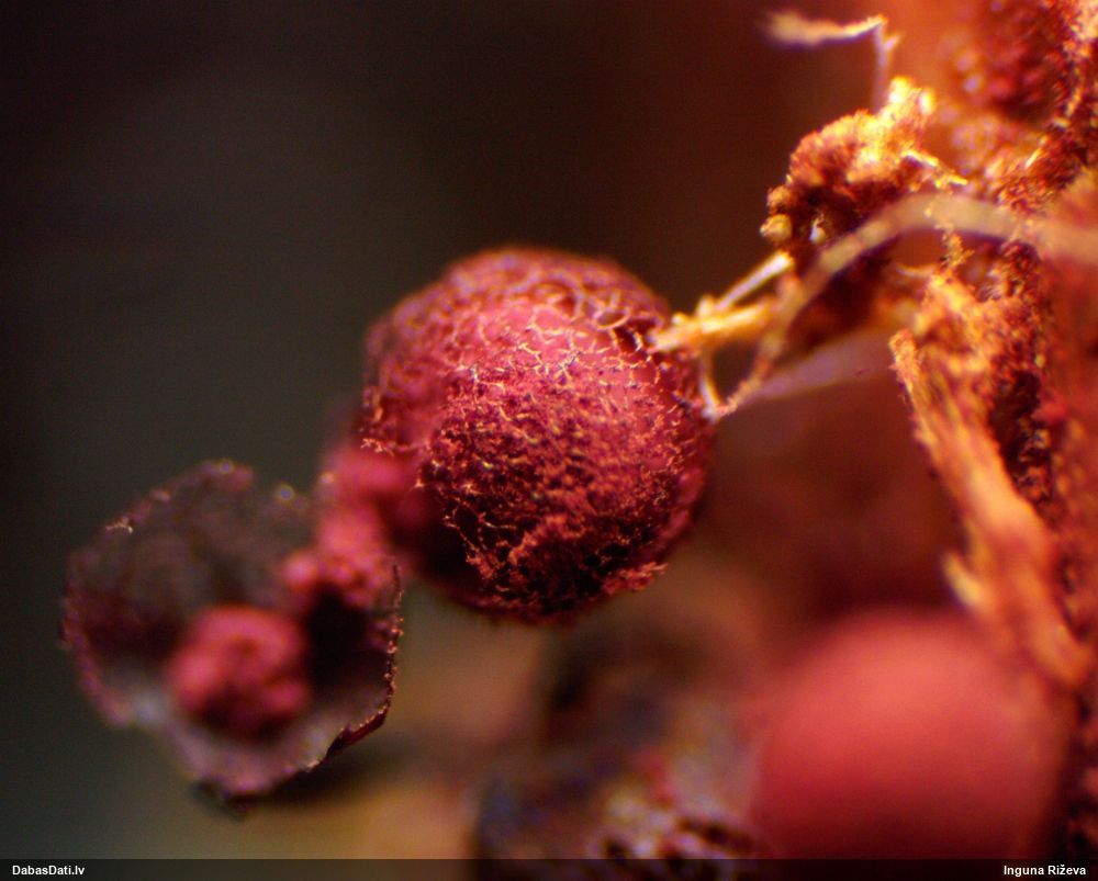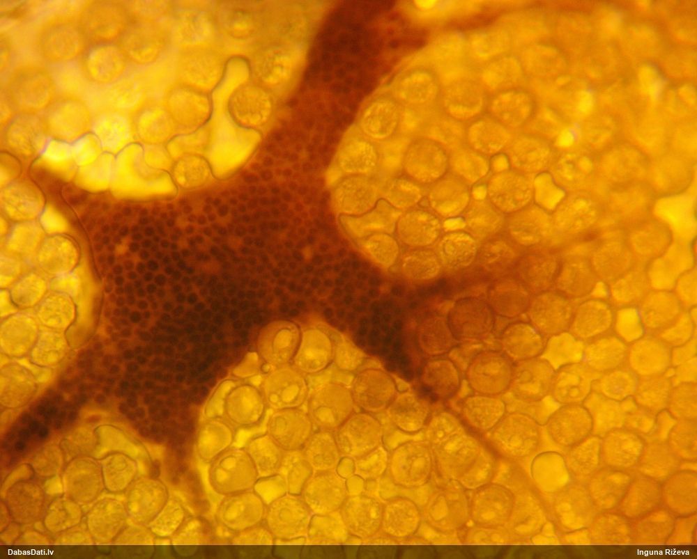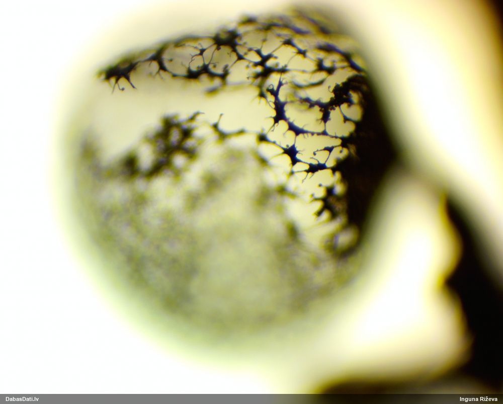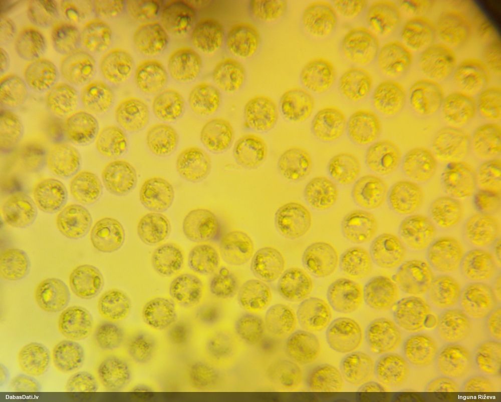 Ļoti ļoti labs atradums! Šo varētu likt aizsargājamo sugu sarakstā, jo pasaulē reti ziņota, Latvijā tikai izcilās vietās atrasta. Par laimi, paraugā bija arī nobrieduši eksemplāri, kam sporu mākonis knapi turējās klāt - un tā ir arī raksturīga sugas pazīme. Bet visuzskatāmākais te ir sporu virsmas raksts, tāpēc te svarīgi redzēt sporas vislielākajā palielinājumā.