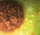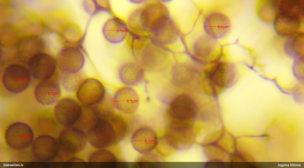 Ļoti ļoti labs atradums! Šo varētu likt aizsargājamo sugu sarakstā, jo pasaulē reti ziņota, Latvijā tikai izcilās vietās atrasta. Par laimi, paraugā bija arī nobrieduši eksemplāri, kam sporu mākonis knapi turējās klāt - un tā ir arī raksturīga sugas pazīme. Bet visuzskatāmākais te ir sporu virsmas raksts, tāpēc te svarīgi redzēt sporas vislielākajā palielinājumā.