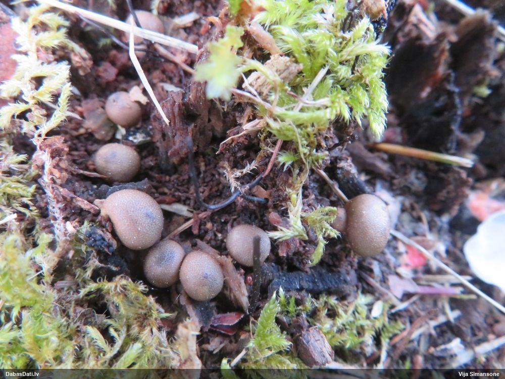 Hmm, nepievērsu tam uzmanību, bet tas interesanti, paldies! Vispār izskatās pēc vālenītes, ne kūlītes, speciāli salīdzināju aprakstus ar Stemonitis splendens, bet mikroskopiski tomēr atbilst visām kūlītes pazīmēm, un abas mikroskopētās kūlītes - vienādas. Tur kāds skujkoks blakus neaug?