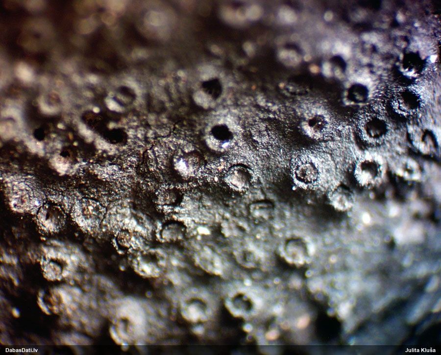 Ļoti ļoti labs atradums! Šo varētu likt aizsargājamo sugu sarakstā, jo pasaulē reti ziņota, Latvijā tikai izcilās vietās atrasta. Par laimi, paraugā bija arī nobrieduši eksemplāri, kam sporu mākonis knapi turējās klāt - un tā ir arī raksturīga sugas pazīme. Bet visuzskatāmākais te ir sporu virsmas raksts, tāpēc te svarīgi redzēt sporas vislielākajā palielinājumā.