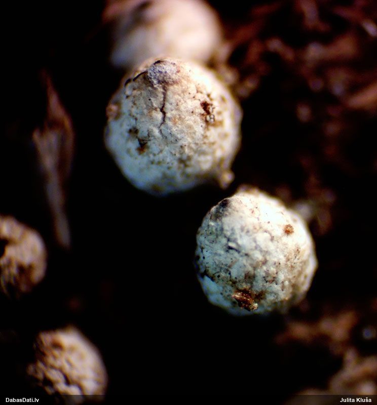 Ļoti ļoti labs atradums! Šo varētu likt aizsargājamo sugu sarakstā, jo pasaulē reti ziņota, Latvijā tikai izcilās vietās atrasta. Par laimi, paraugā bija arī nobrieduši eksemplāri, kam sporu mākonis knapi turējās klāt - un tā ir arī raksturīga sugas pazīme. Bet visuzskatāmākais te ir sporu virsmas raksts, tāpēc te svarīgi redzēt sporas vislielākajā palielinājumā.