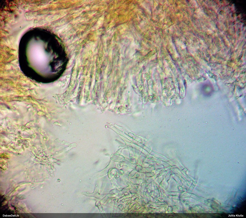 Šis interesants. Vālīšu galā ir taurītes kā S.flavogenita, bet tai jābūt garumā 4-7 mm, kamēr te ir 2-3 mm. Savukārt 2020. gadā ir izdalīta S. pseudoflavogenita, kas ir 3-5 mm gara, un kam sporas 7-8 mkm, bet te - 8-9 mkm. Vēl padomāšu. :)