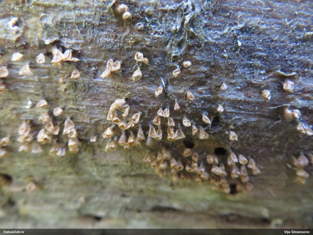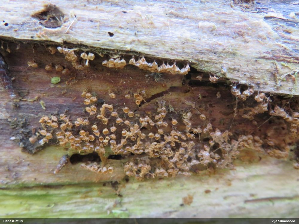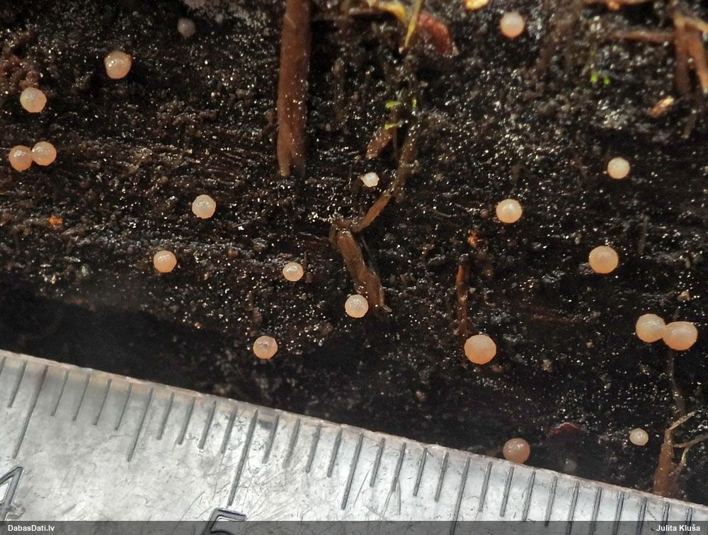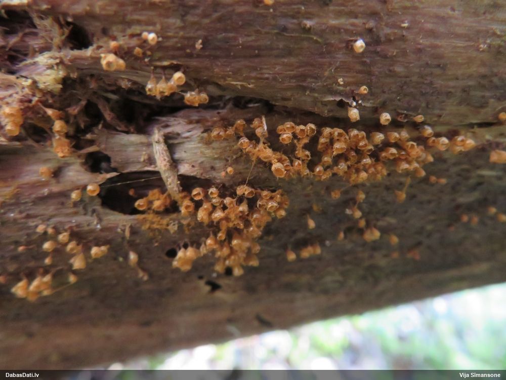 Hmm, nepievērsu tam uzmanību, bet tas interesanti, paldies! Vispār izskatās pēc vālenītes, ne kūlītes, speciāli salīdzināju aprakstus ar Stemonitis splendens, bet mikroskopiski tomēr atbilst visām kūlītes pazīmēm, un abas mikroskopētās kūlītes - vienādas. Tur kāds skujkoks blakus neaug?