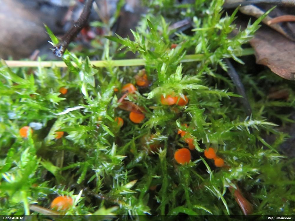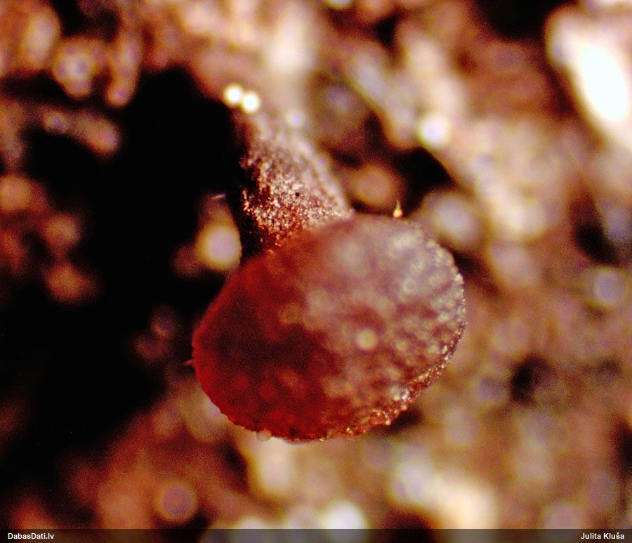 Ļoti ļoti labs atradums! Šo varētu likt aizsargājamo sugu sarakstā, jo pasaulē reti ziņota, Latvijā tikai izcilās vietās atrasta. Par laimi, paraugā bija arī nobrieduši eksemplāri, kam sporu mākonis knapi turējās klāt - un tā ir arī raksturīga sugas pazīme. Bet visuzskatāmākais te ir sporu virsmas raksts, tāpēc te svarīgi redzēt sporas vislielākajā palielinājumā.