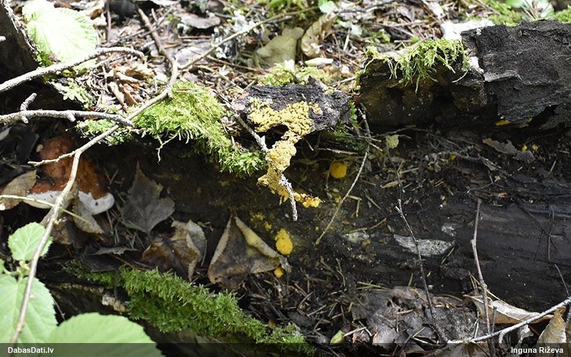Skujkoks nav par tuvumā. Ir tikai lapu koki - lazda, kastanis, ābelītes. Otrpus celmam (D pusē) lejasdaļā, ko pamanīju pirmo, arī bija kaut kas no šim līdzīga, bet tik izsporojies, ka palicis tikai paliels brūns sporu pleķis. Intriga pavērot nākamgad.