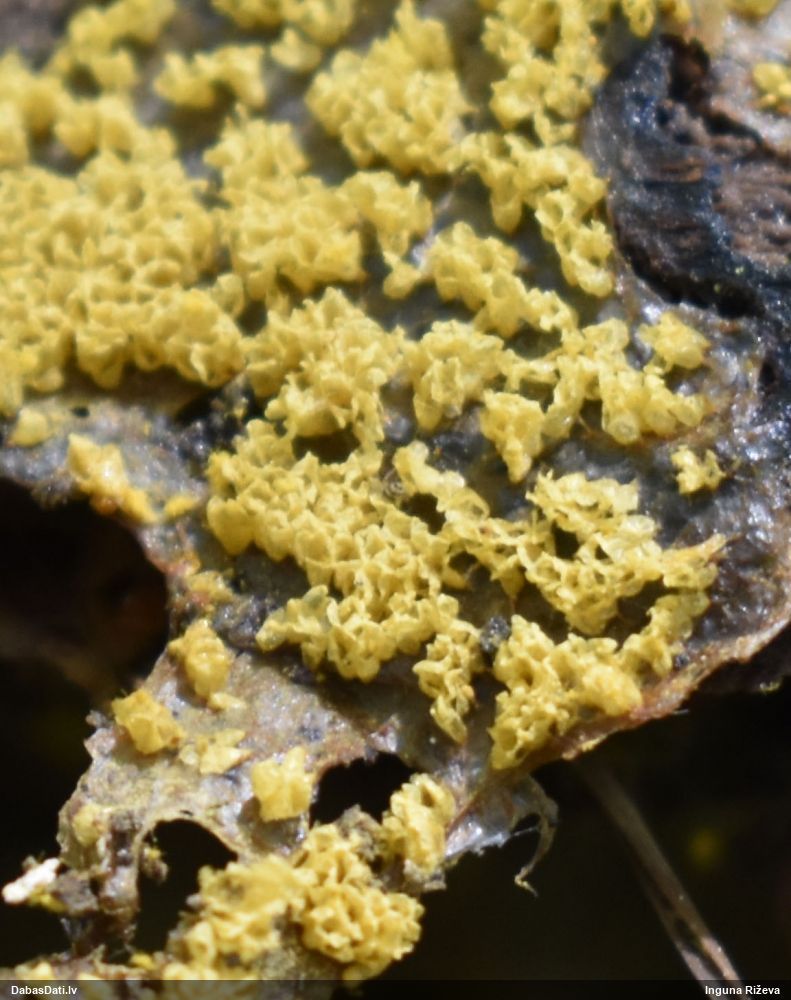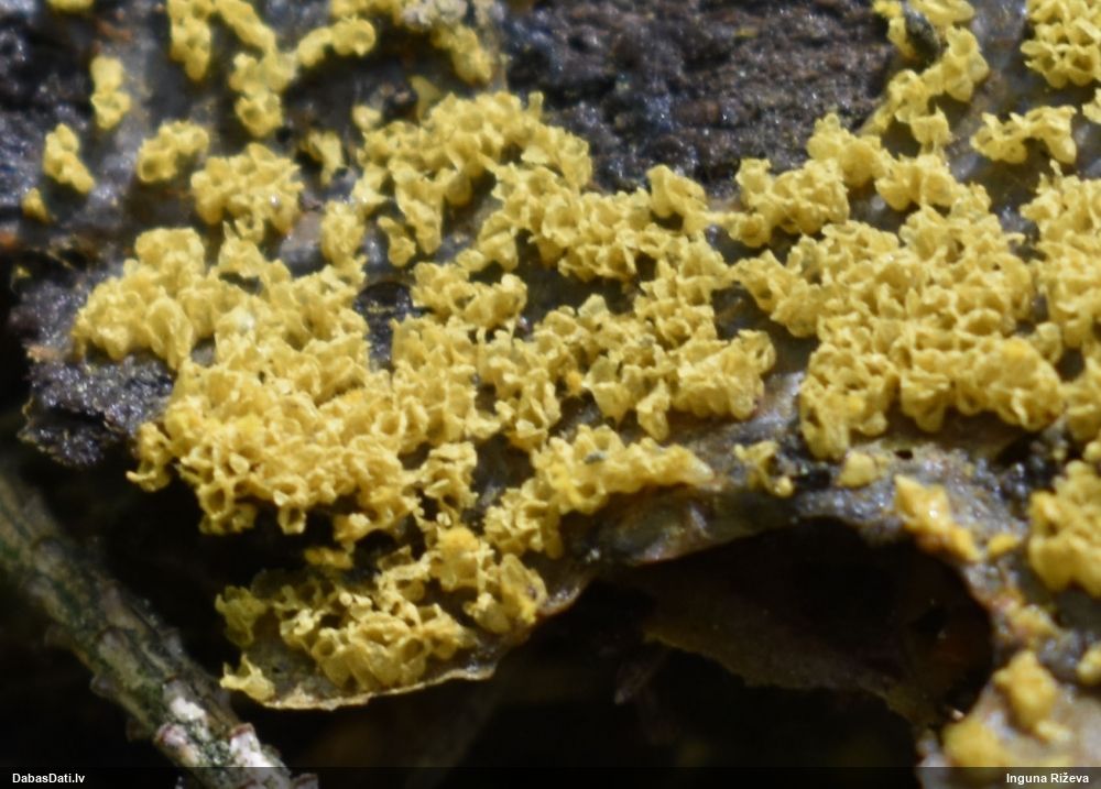 Šim Vijas paraugam iekšas precīzi tādas pašas - baltdzeltenas, ar kapilīciju ar maziem mezgliem, un virsma balta. Sporas gan lielākas: https://dabasdati.lv/lv/observation/b146f03a39b8789e2897007d9e464255/