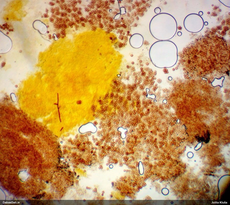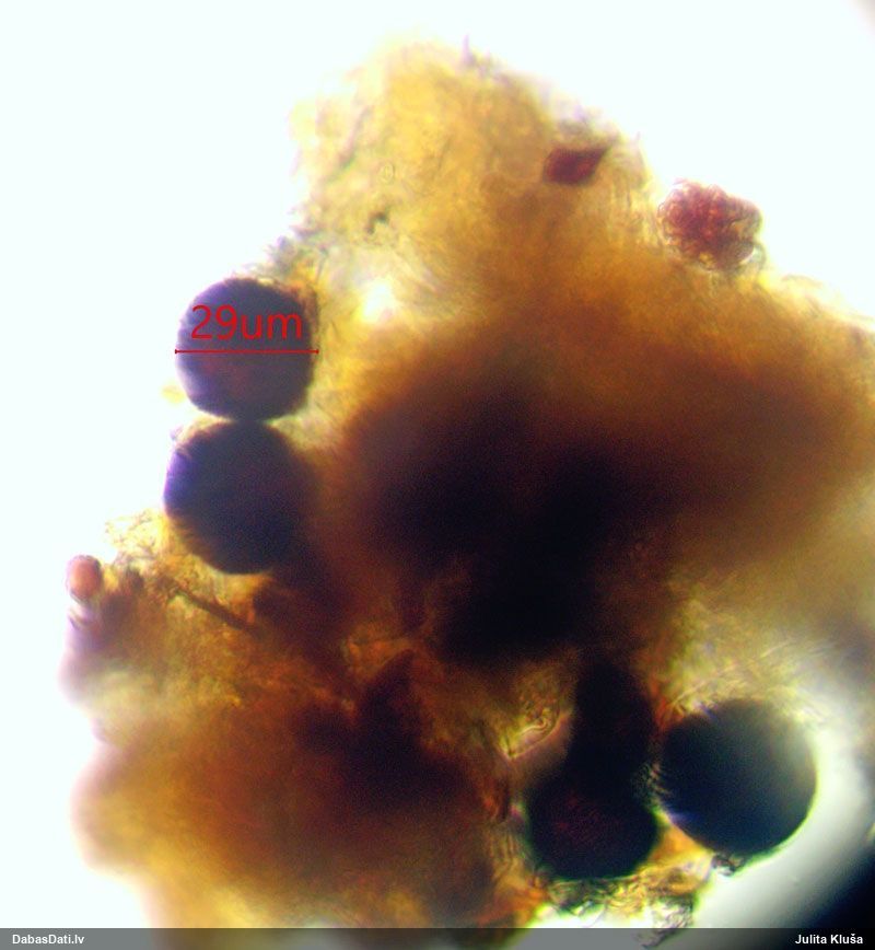Ļoti ļoti labs atradums! Šo varētu likt aizsargājamo sugu sarakstā, jo pasaulē reti ziņota, Latvijā tikai izcilās vietās atrasta. Par laimi, paraugā bija arī nobrieduši eksemplāri, kam sporu mākonis knapi turējās klāt - un tā ir arī raksturīga sugas pazīme. Bet visuzskatāmākais te ir sporu virsmas raksts, tāpēc te svarīgi redzēt sporas vislielākajā palielinājumā.