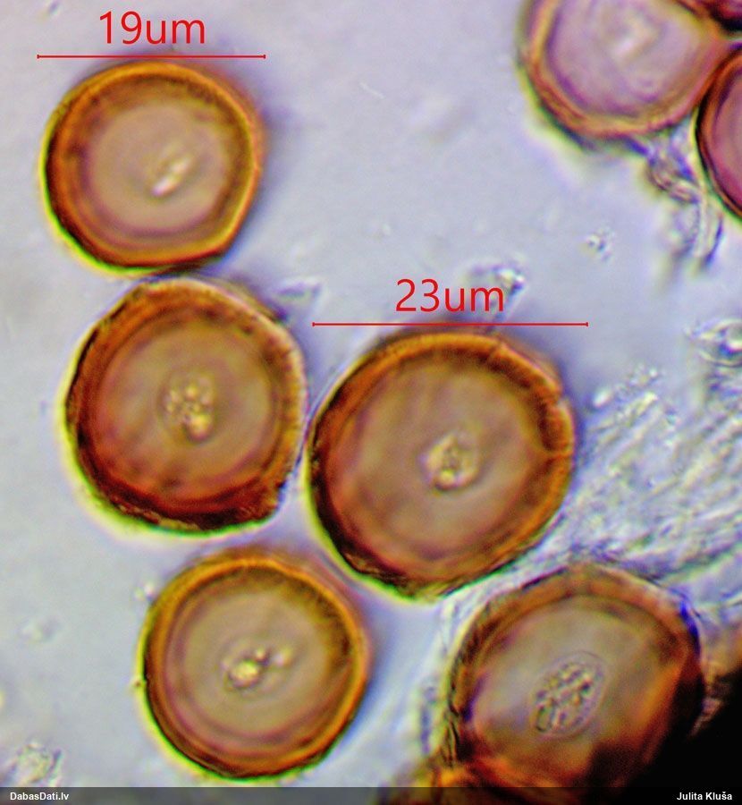 Liels paldies Vija par mikroskopējumiem!! Jā nu, saprast neko tā skaidri nevar. Šitie visi tak izskatās kā tipiski rufas, bet sporas katram citādas.. Nu kaut vai šis pats un šis: https://dabasdati.lv/lv/observation/123bcde42995588676726de1df696803/ Vizuāli pilnīgi dvīņi, un tik un tā sporas atšķiras. Un vasaras sākums un apaļas sporas - licentii šim arī nesanāks, lai arī rūsgano pakāji varētu ieskaitīt. Bez DNS pētījumiem laikam nav vērts mēģināt šos saprast.