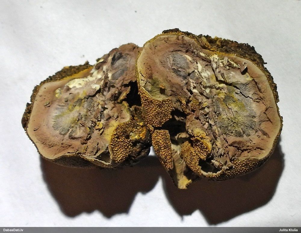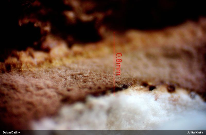 Šim Vijas paraugam iekšas precīzi tādas pašas - baltdzeltenas, ar kapilīciju ar maziem mezgliem, un virsma balta. Sporas gan lielākas: https://dabasdati.lv/lv/observation/b146f03a39b8789e2897007d9e464255/