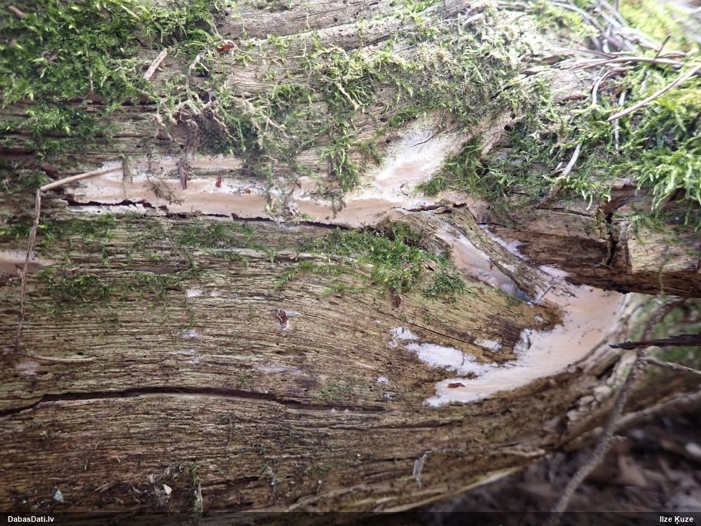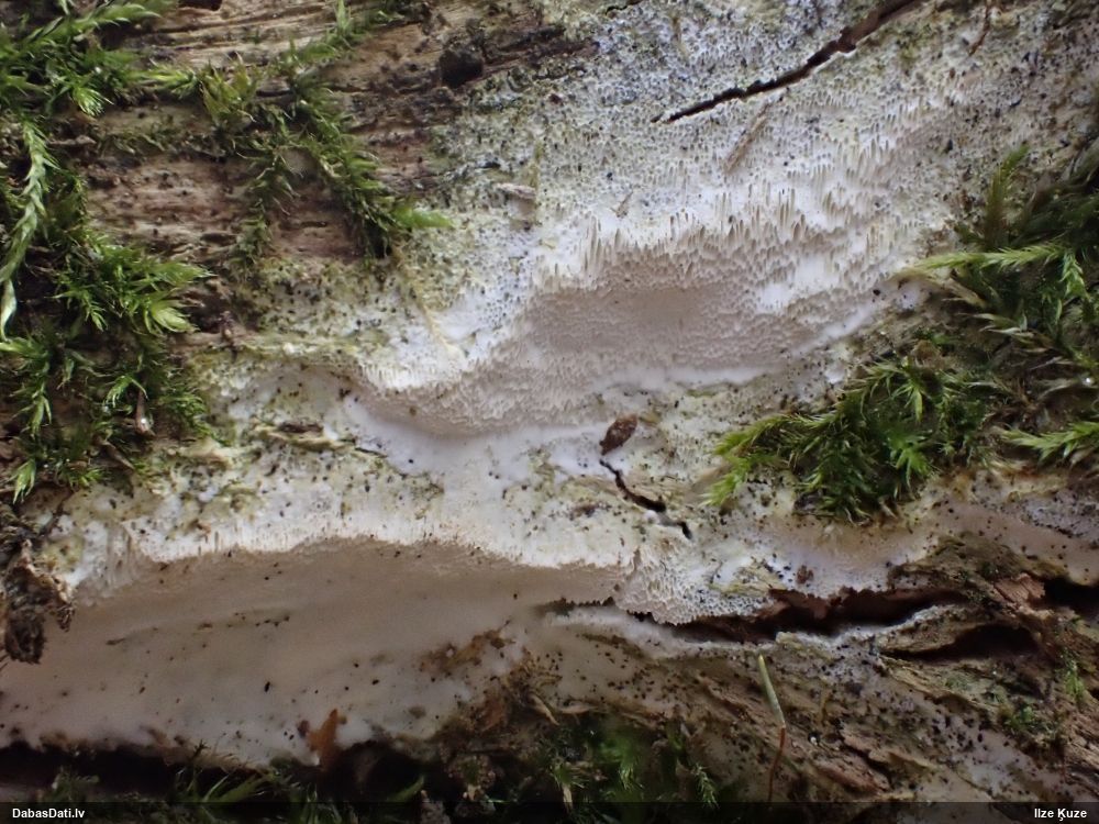 Šim Vijas paraugam iekšas precīzi tādas pašas - baltdzeltenas, ar kapilīciju ar maziem mezgliem, un virsma balta. Sporas gan lielākas: https://dabasdati.lv/lv/observation/b146f03a39b8789e2897007d9e464255/