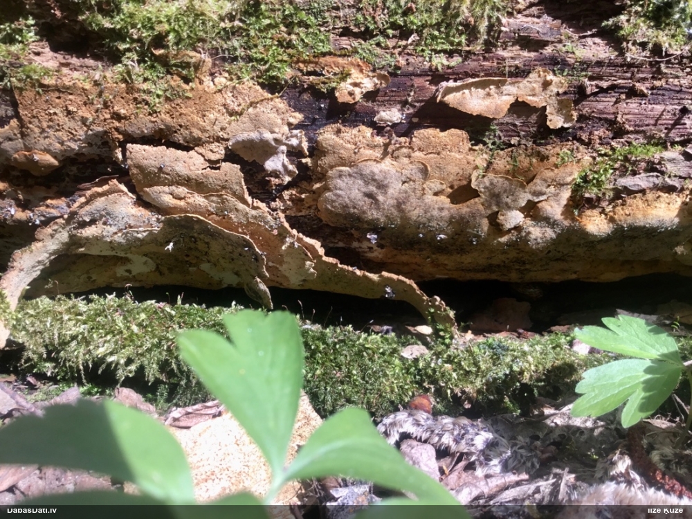 Skujkoks nav par tuvumā. Ir tikai lapu koki - lazda, kastanis, ābelītes. Otrpus celmam (D pusē) lejasdaļā, ko pamanīju pirmo, arī bija kaut kas no šim līdzīga, bet tik izsporojies, ka palicis tikai paliels brūns sporu pleķis. Intriga pavērot nākamgad.