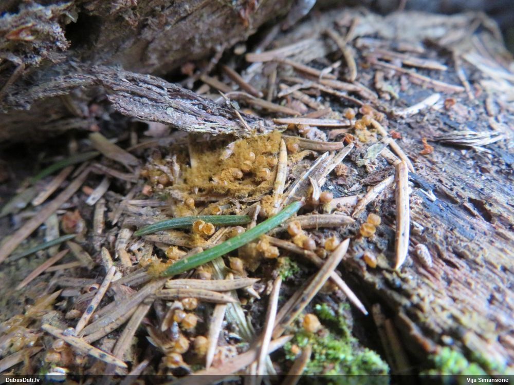 Hmm, nepievērsu tam uzmanību, bet tas interesanti, paldies! Vispār izskatās pēc vālenītes, ne kūlītes, speciāli salīdzināju aprakstus ar Stemonitis splendens, bet mikroskopiski tomēr atbilst visām kūlītes pazīmēm, un abas mikroskopētās kūlītes - vienādas. Tur kāds skujkoks blakus neaug?