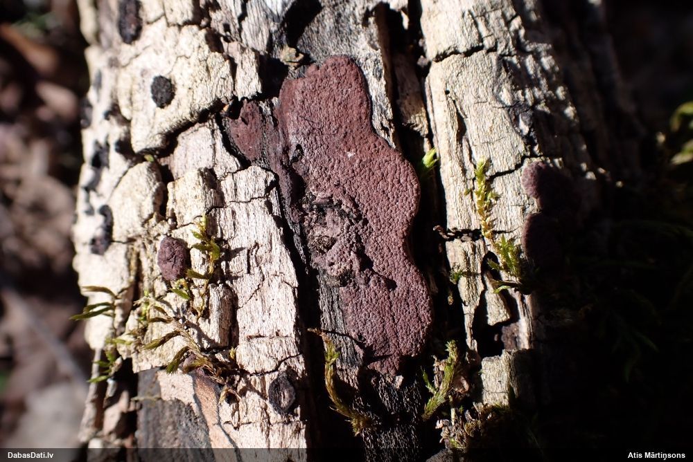 Skujkoks nav par tuvumā. Ir tikai lapu koki - lazda, kastanis, ābelītes. Otrpus celmam (D pusē) lejasdaļā, ko pamanīju pirmo, arī bija kaut kas no šim līdzīga, bet tik izsporojies, ka palicis tikai paliels brūns sporu pleķis. Intriga pavērot nākamgad.