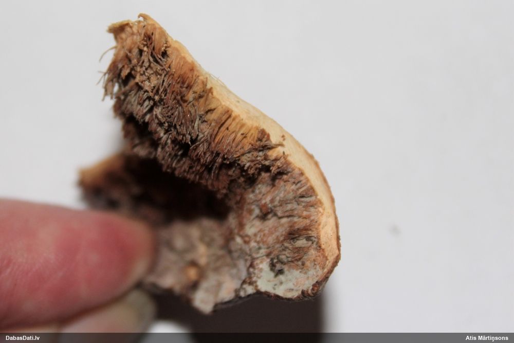Šim Vijas paraugam iekšas precīzi tādas pašas - baltdzeltenas, ar kapilīciju ar maziem mezgliem, un virsma balta. Sporas gan lielākas: https://dabasdati.lv/lv/observation/b146f03a39b8789e2897007d9e464255/