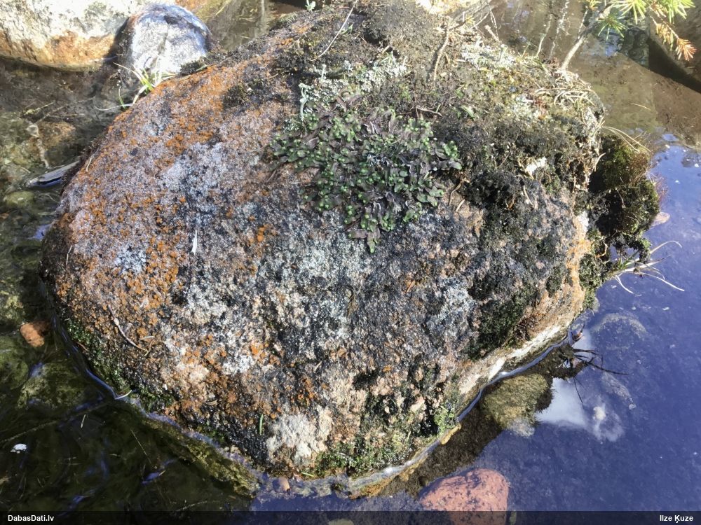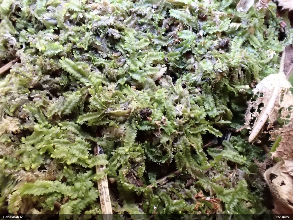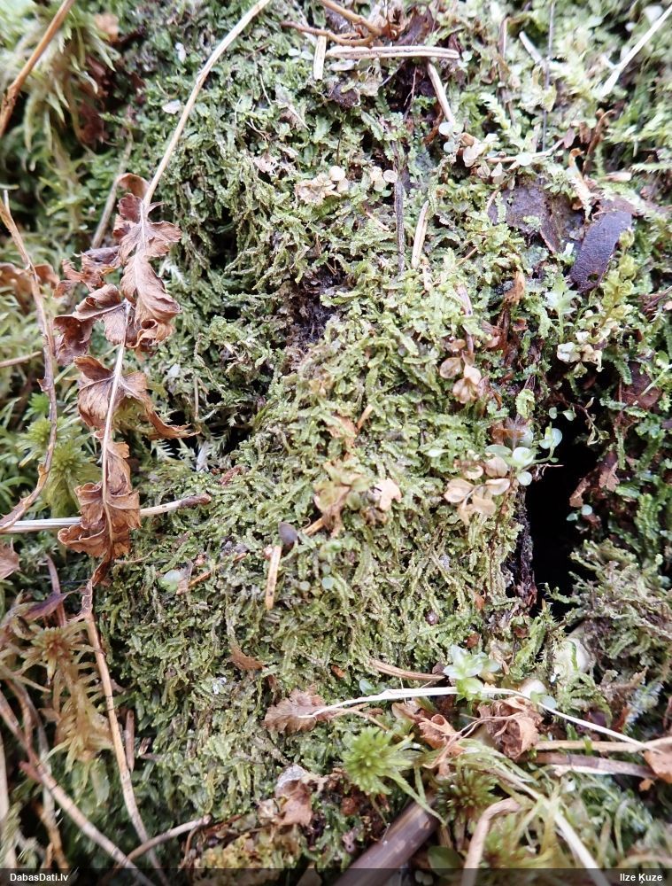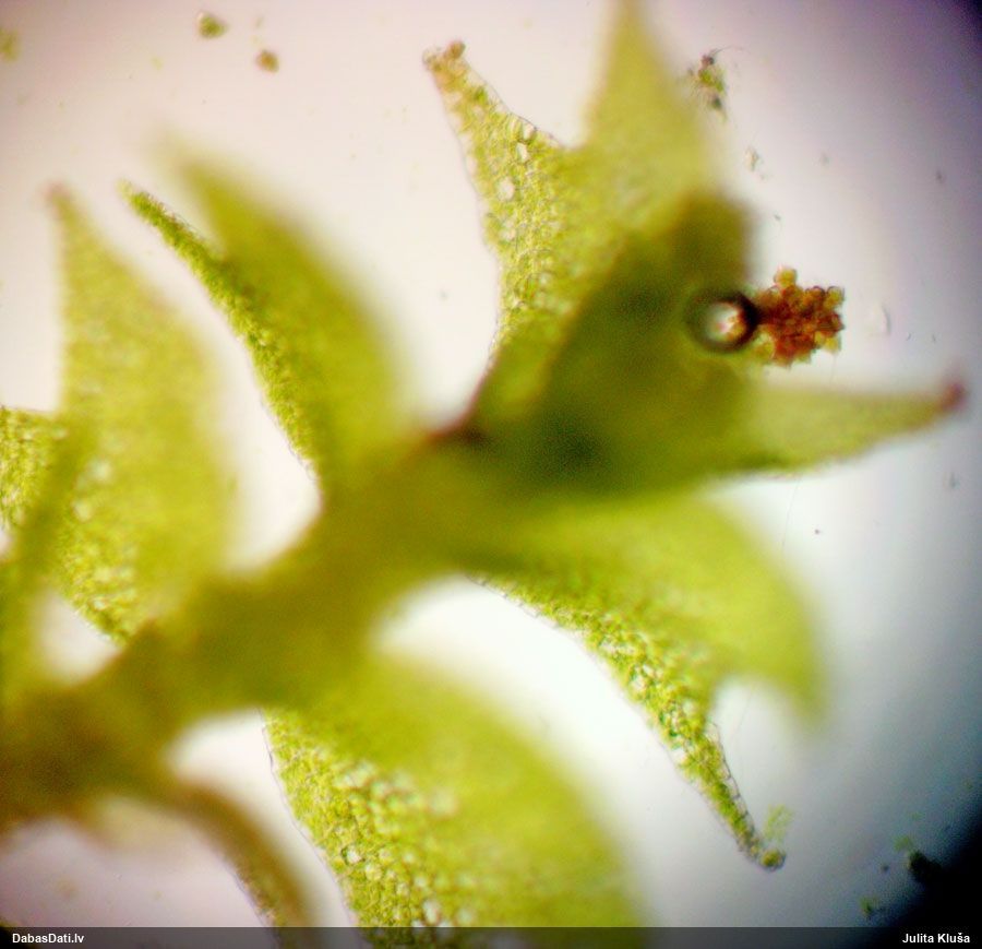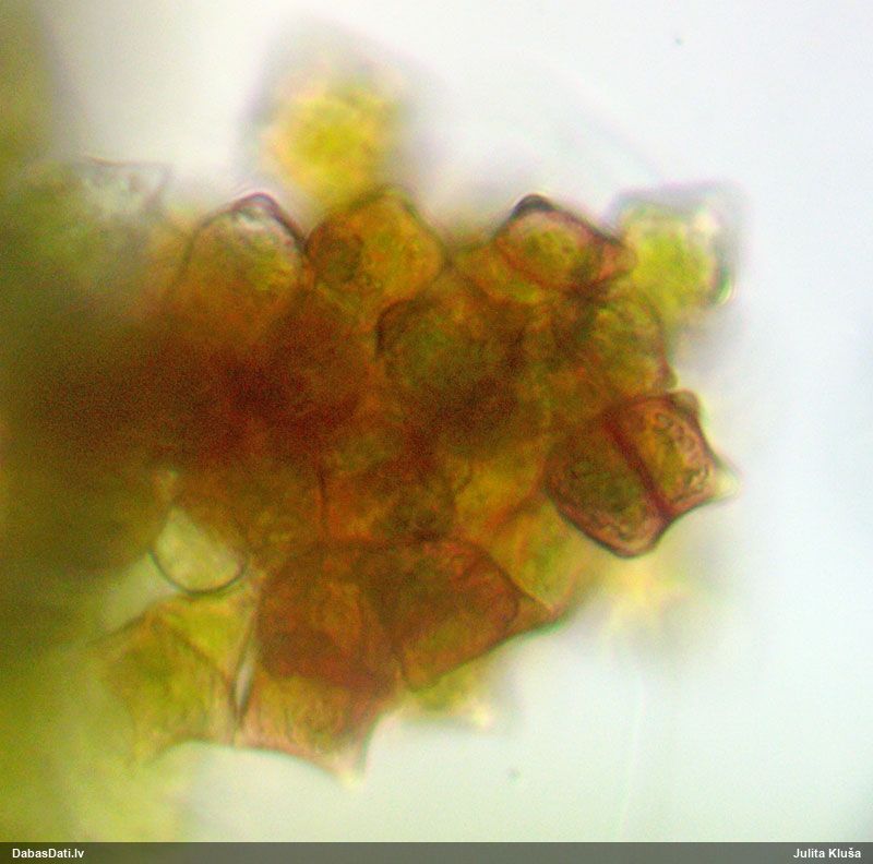 Ļoti ļoti labs atradums! Šo varētu likt aizsargājamo sugu sarakstā, jo pasaulē reti ziņota, Latvijā tikai izcilās vietās atrasta. Par laimi, paraugā bija arī nobrieduši eksemplāri, kam sporu mākonis knapi turējās klāt - un tā ir arī raksturīga sugas pazīme. Bet visuzskatāmākais te ir sporu virsmas raksts, tāpēc te svarīgi redzēt sporas vislielākajā palielinājumā.