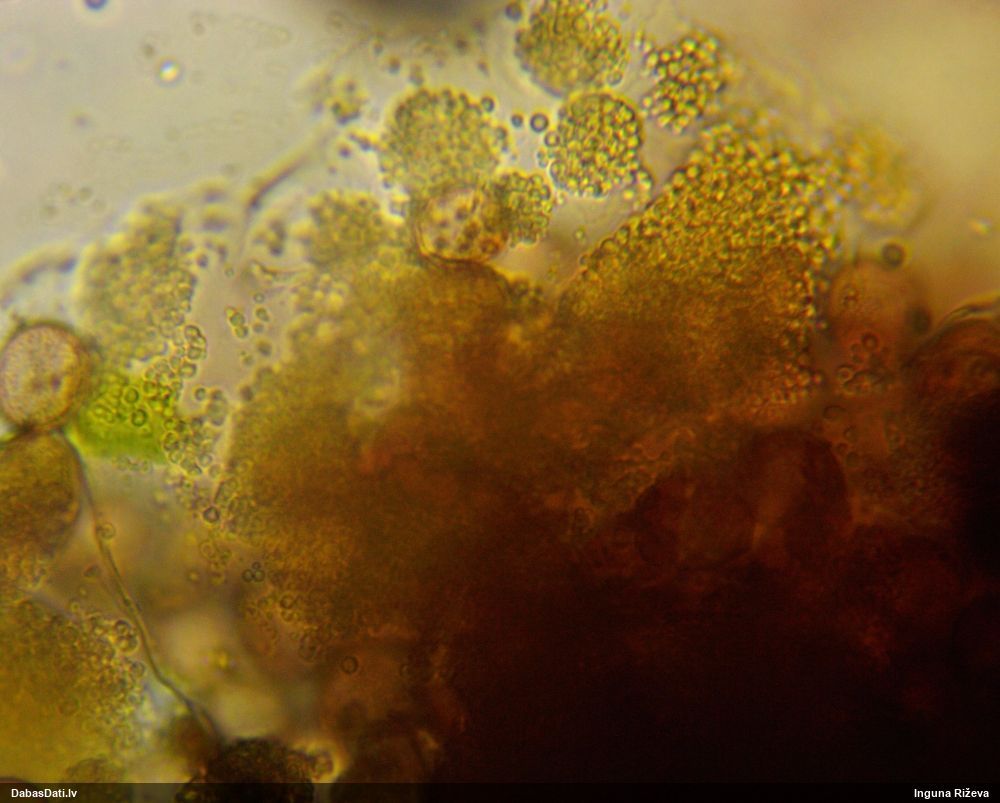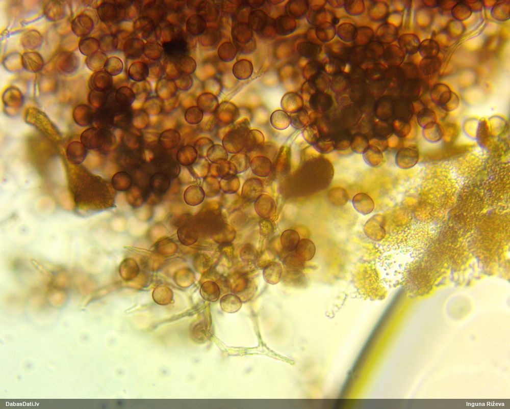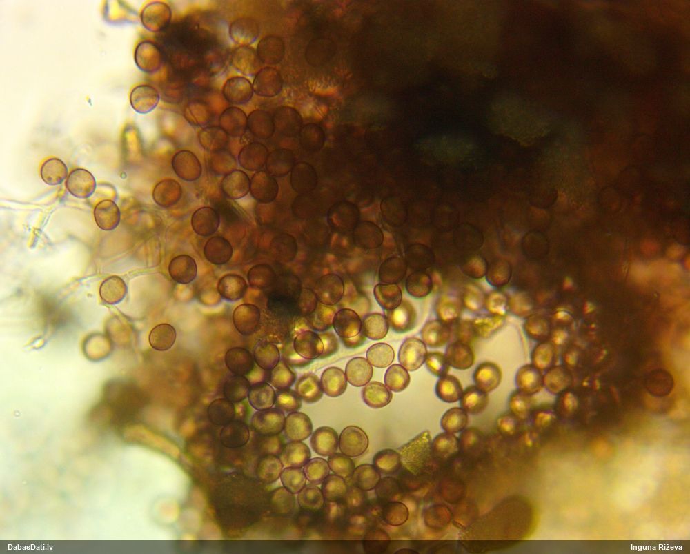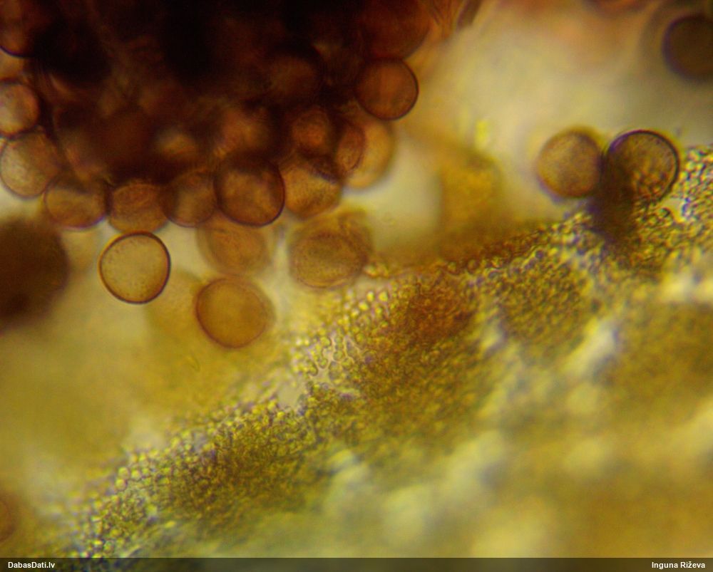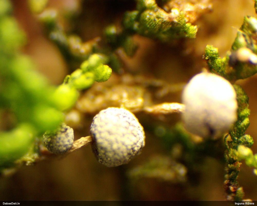 Ļoti ļoti labs atradums! Šo varētu likt aizsargājamo sugu sarakstā, jo pasaulē reti ziņota, Latvijā tikai izcilās vietās atrasta. Par laimi, paraugā bija arī nobrieduši eksemplāri, kam sporu mākonis knapi turējās klāt - un tā ir arī raksturīga sugas pazīme. Bet visuzskatāmākais te ir sporu virsmas raksts, tāpēc te svarīgi redzēt sporas vislielākajā palielinājumā.