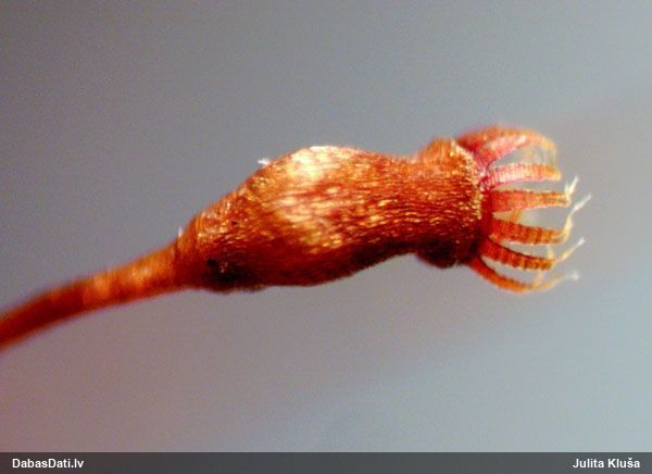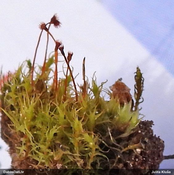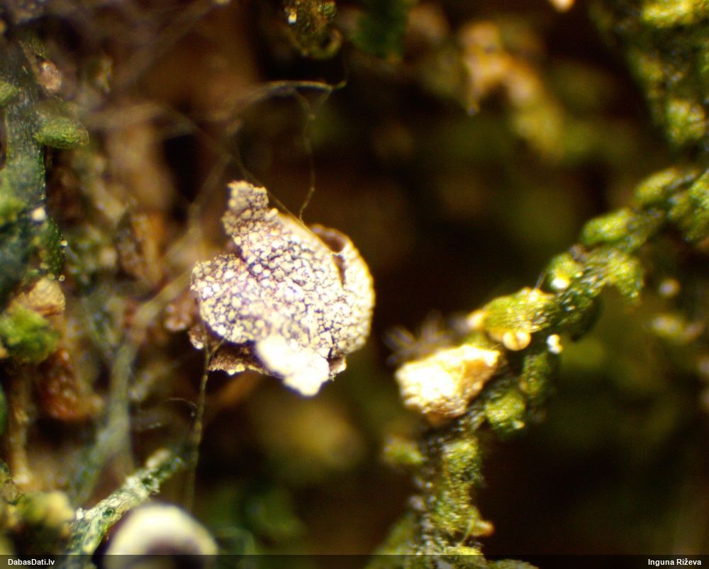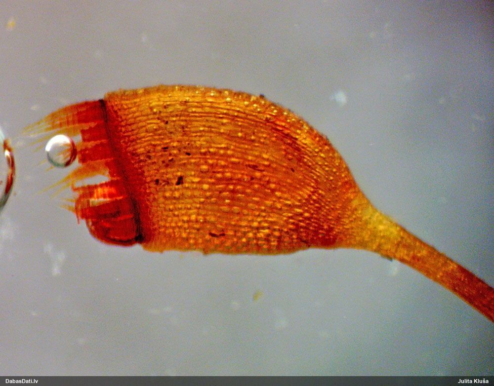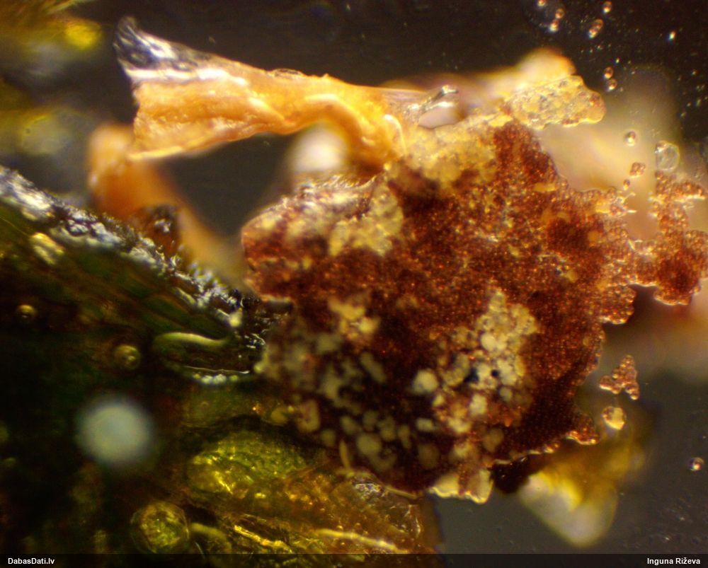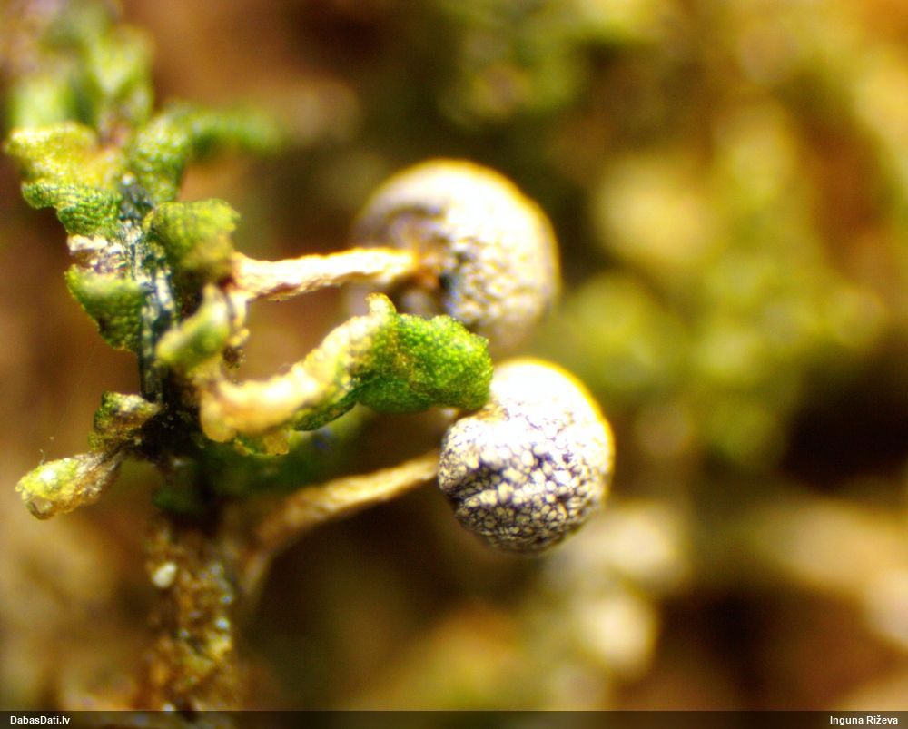 Ļoti ļoti labs atradums! Šo varētu likt aizsargājamo sugu sarakstā, jo pasaulē reti ziņota, Latvijā tikai izcilās vietās atrasta. Par laimi, paraugā bija arī nobrieduši eksemplāri, kam sporu mākonis knapi turējās klāt - un tā ir arī raksturīga sugas pazīme. Bet visuzskatāmākais te ir sporu virsmas raksts, tāpēc te svarīgi redzēt sporas vislielākajā palielinājumā.