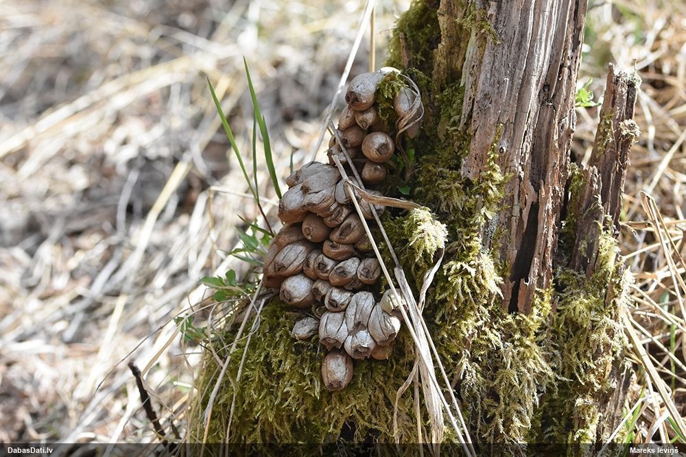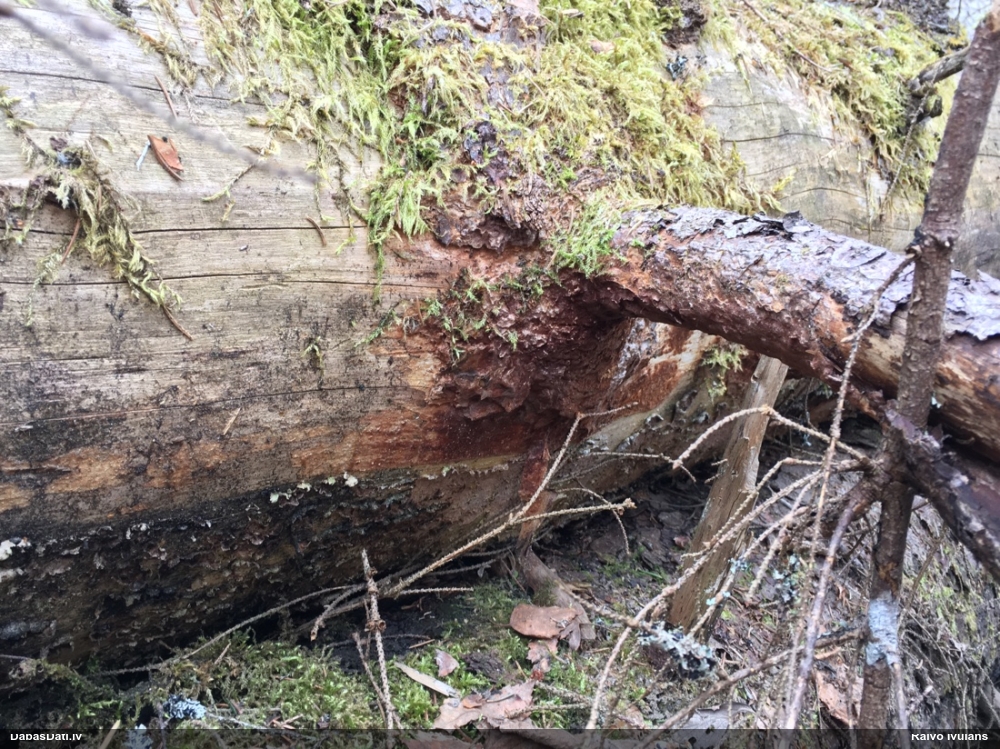 Skujkoks nav par tuvumā. Ir tikai lapu koki - lazda, kastanis, ābelītes. Otrpus celmam (D pusē) lejasdaļā, ko pamanīju pirmo, arī bija kaut kas no šim līdzīga, bet tik izsporojies, ka palicis tikai paliels brūns sporu pleķis. Intriga pavērot nākamgad.