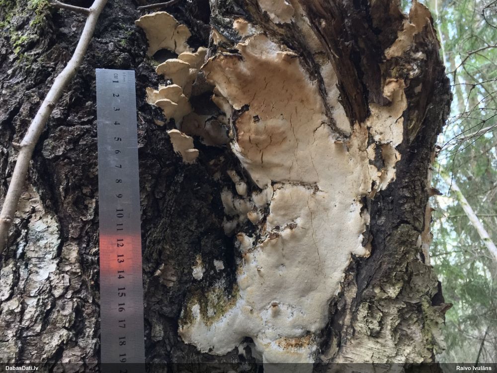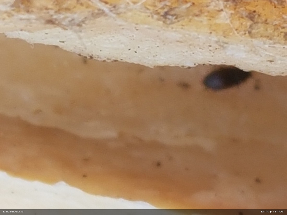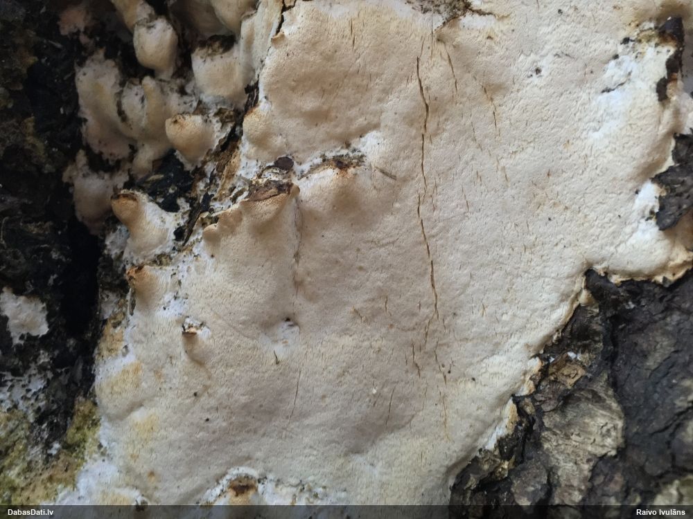 Šim Vijas paraugam iekšas precīzi tādas pašas - baltdzeltenas, ar kapilīciju ar maziem mezgliem, un virsma balta. Sporas gan lielākas: https://dabasdati.lv/lv/observation/b146f03a39b8789e2897007d9e464255/