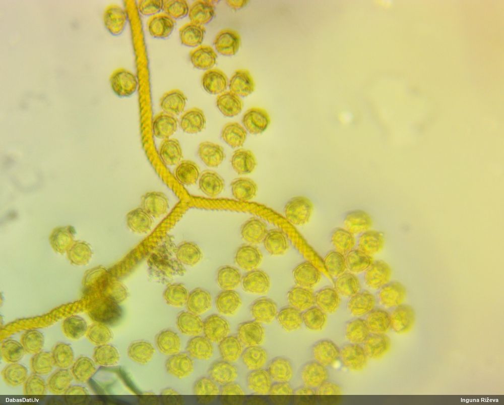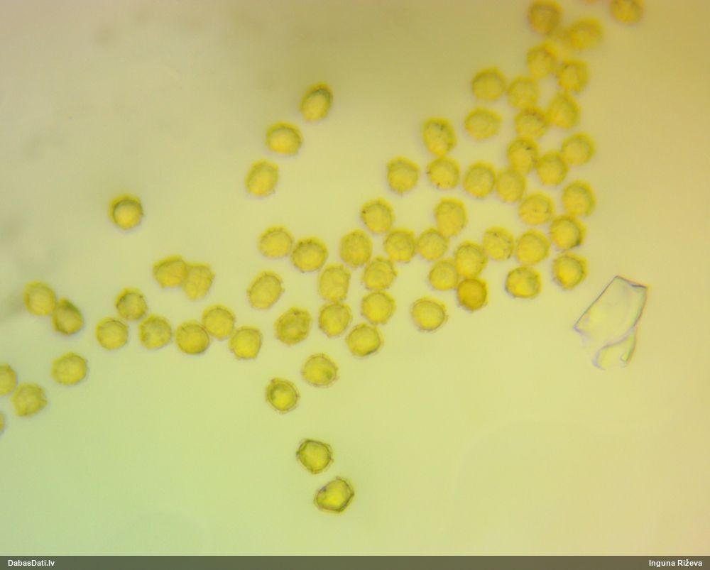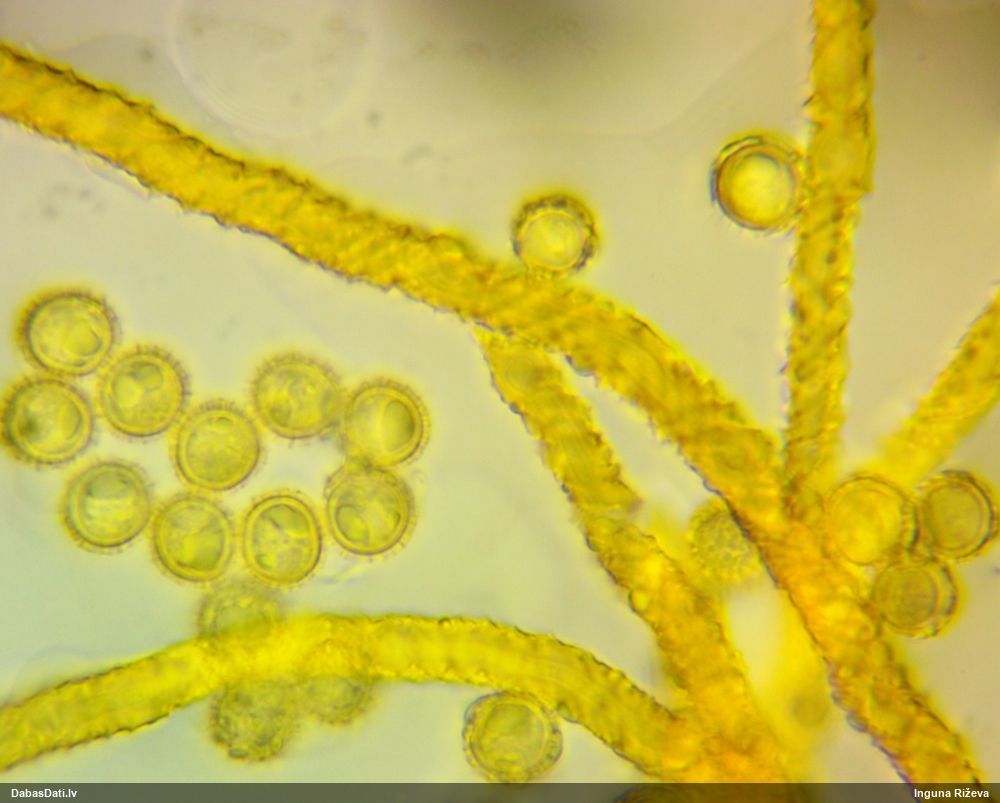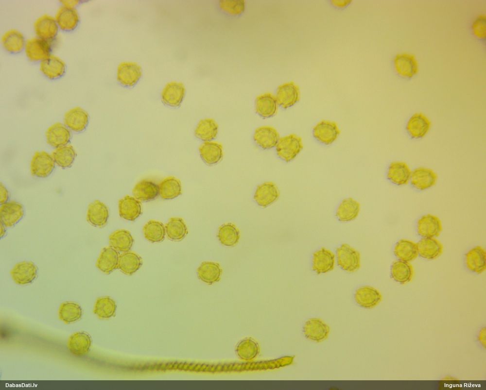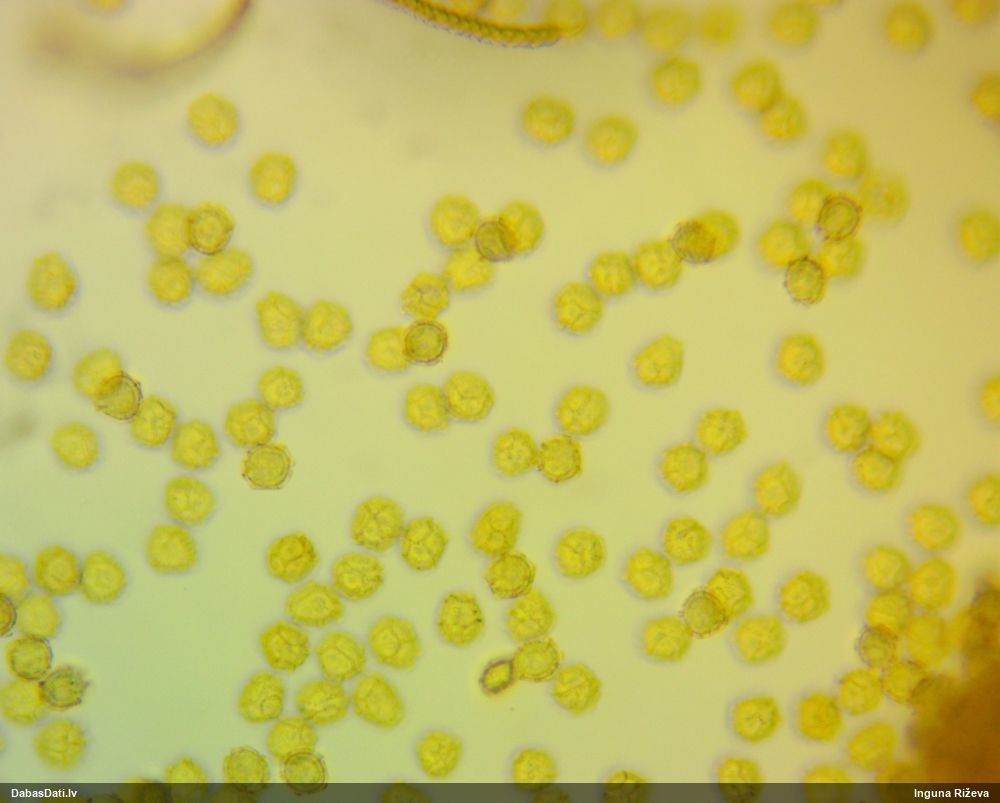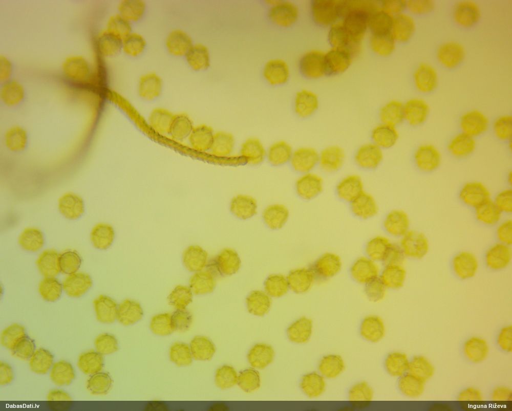 Ļoti ļoti labs atradums! Šo varētu likt aizsargājamo sugu sarakstā, jo pasaulē reti ziņota, Latvijā tikai izcilās vietās atrasta. Par laimi, paraugā bija arī nobrieduši eksemplāri, kam sporu mākonis knapi turējās klāt - un tā ir arī raksturīga sugas pazīme. Bet visuzskatāmākais te ir sporu virsmas raksts, tāpēc te svarīgi redzēt sporas vislielākajā palielinājumā.