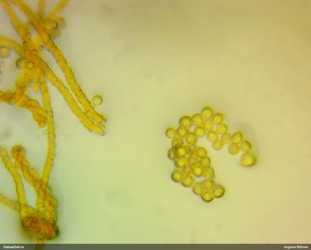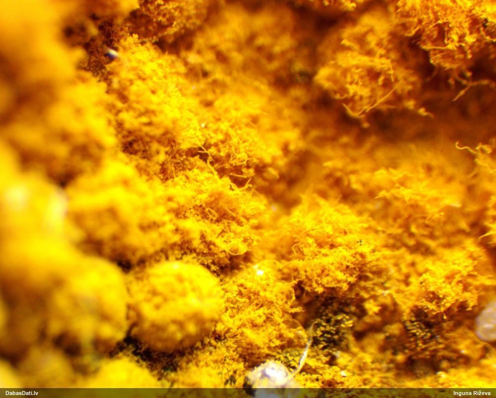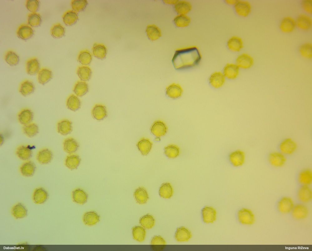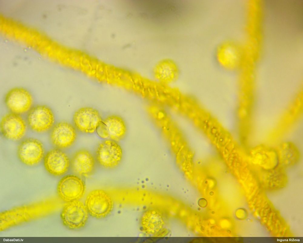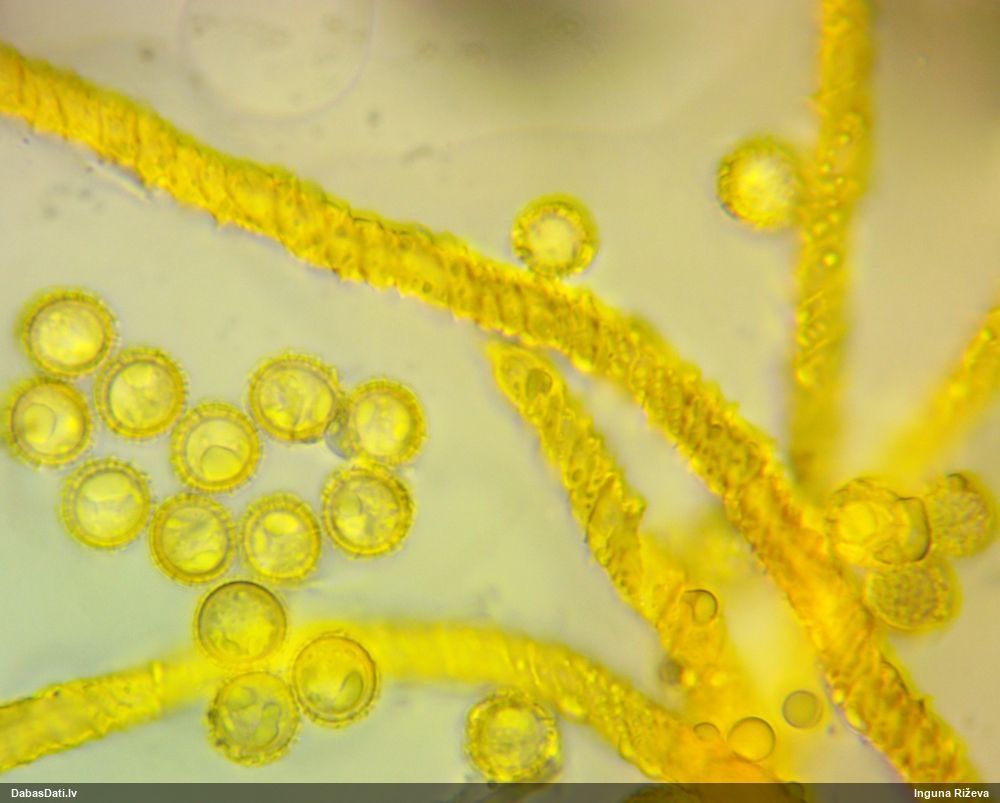 Ļoti ļoti labs atradums! Šo varētu likt aizsargājamo sugu sarakstā, jo pasaulē reti ziņota, Latvijā tikai izcilās vietās atrasta. Par laimi, paraugā bija arī nobrieduši eksemplāri, kam sporu mākonis knapi turējās klāt - un tā ir arī raksturīga sugas pazīme. Bet visuzskatāmākais te ir sporu virsmas raksts, tāpēc te svarīgi redzēt sporas vislielākajā palielinājumā.